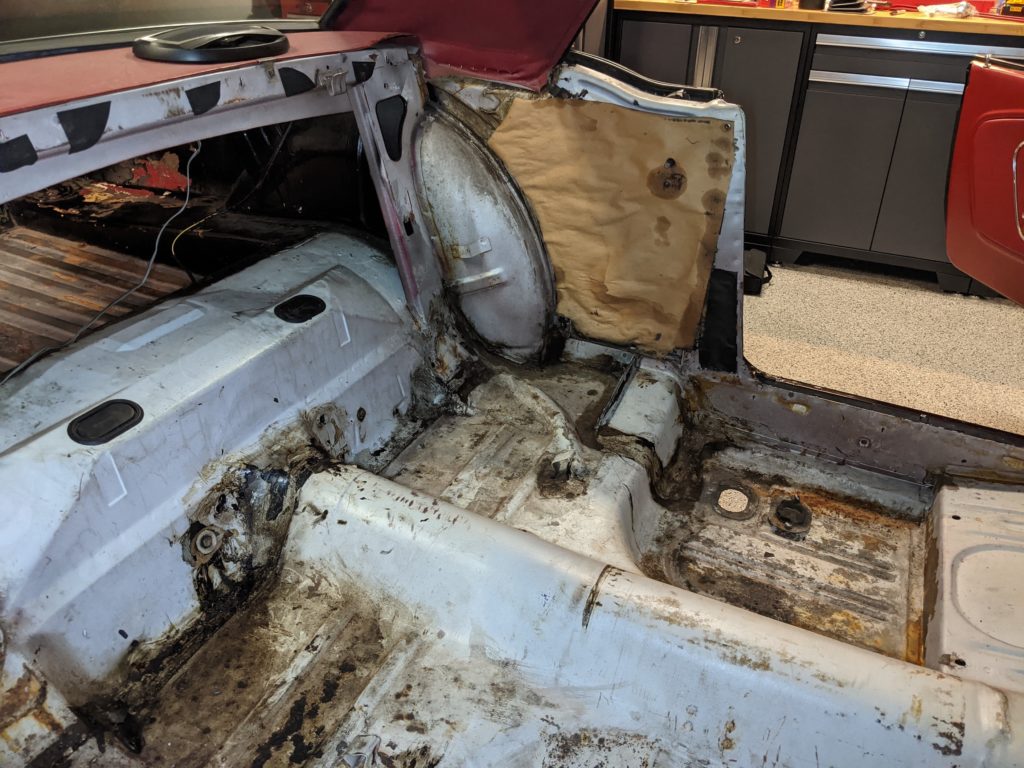 Unfortunately what I found was enough rust to probably necessitate essentially full replacement of all the foot wells, portions of the kick plates, and the rear seat wells. Bummer, this is not going to be as easy as I was originally hoping.