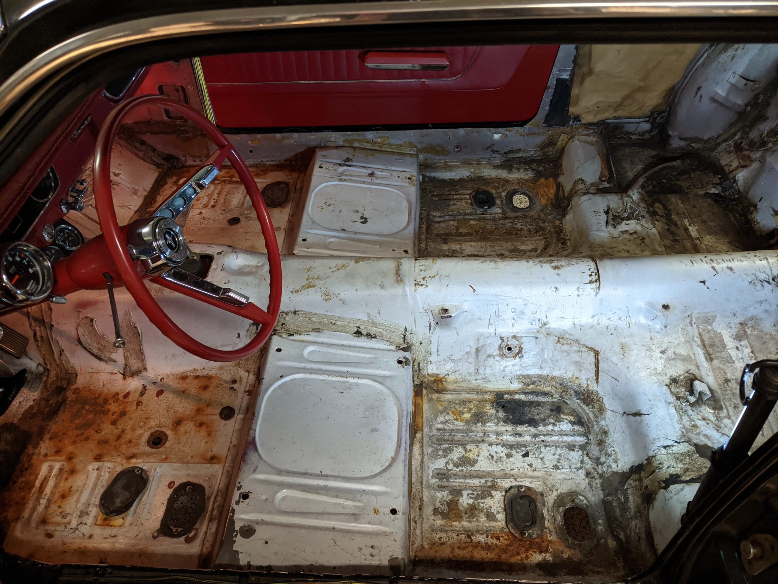 Unfortunately what I found was enough rust to probably necessitate essentially full replacement of all the foot wells, portions of the kick plates, and the rear seat wells. Bummer, this is not going to be as easy as I was originally hoping.