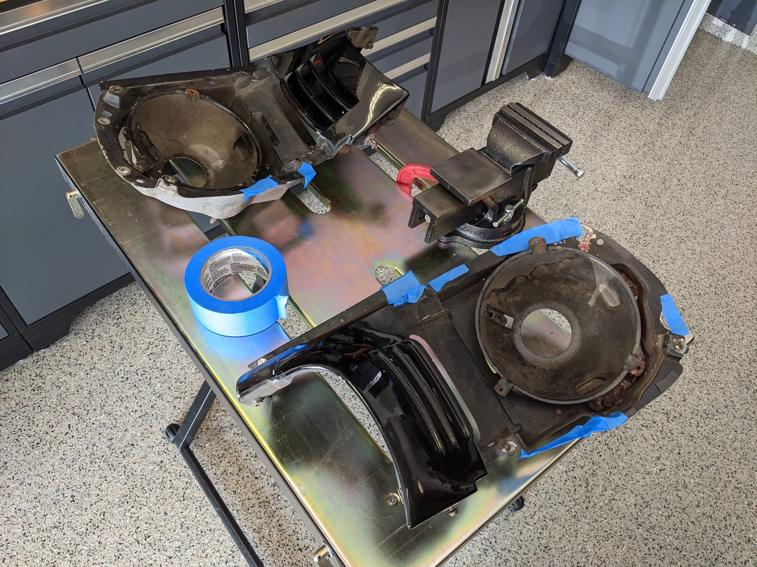 I also had a vague recollection that one of the headlight buckets had been missing a metal tab for one of the screws, allowing it to be loose from the front of the fender. That may have been true at one point, but this time I found that both headlight buckets were missing several sections of metal that help secure them to the fenders. Each piece of blue tape in the picture below indicates metal that is suspiciously absent.