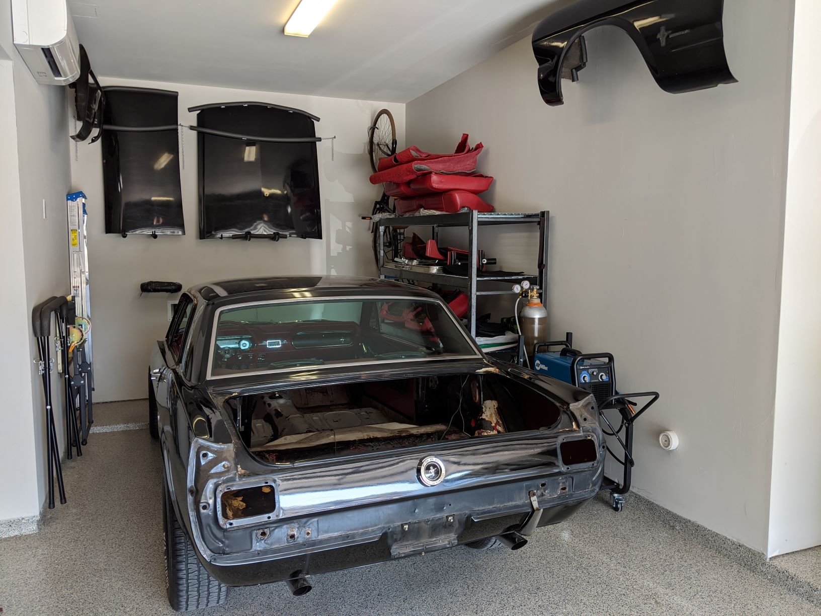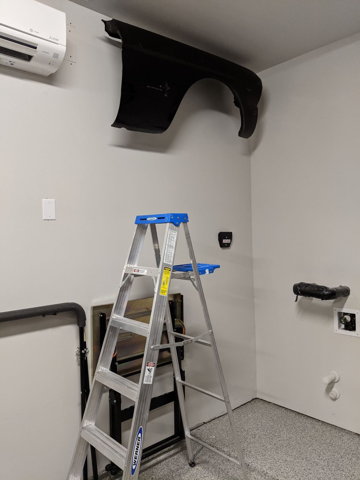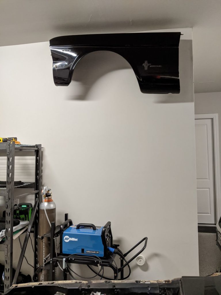 Unfortunately with two other cars wanting to park in the garage space is at a premium and I couldn’t leave the fenders laying around, so I mounted them on the wall to keep them out of the way for now.