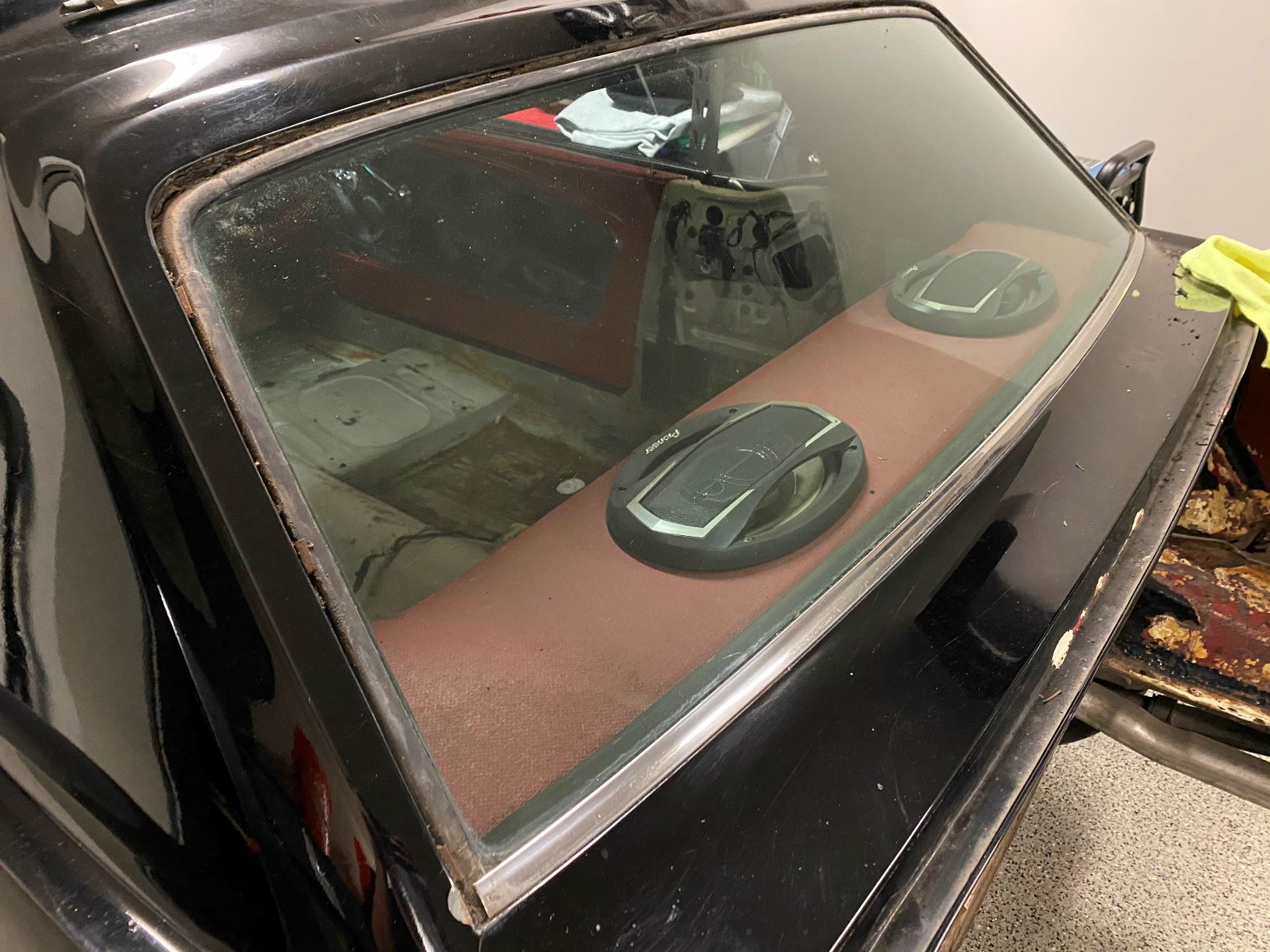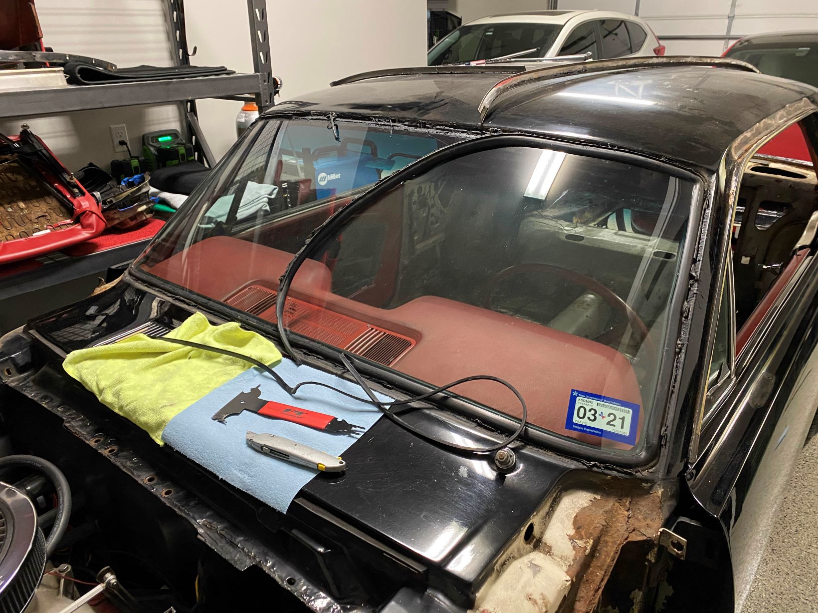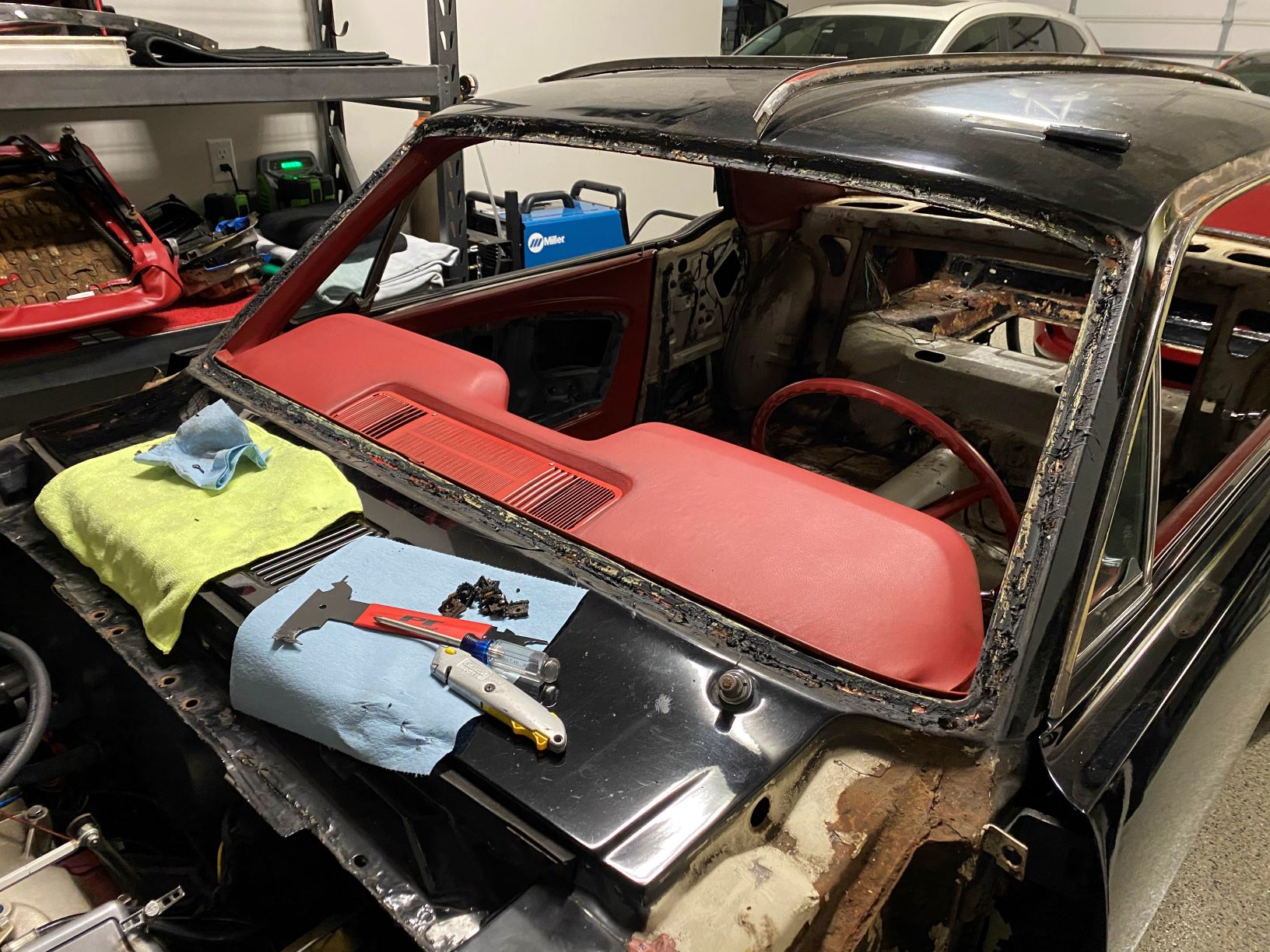 Armed with a cheap “10 in 1 Trim Tool” from Amazon and a dozen YouTube videos I started working at the trim around the rear window. On these old Mustangs the chrome trim around both the rear glass and windshield is held in by metal clips that are notoriously difficult to release and the trim itself has the structural integrity of used aluminum foil.