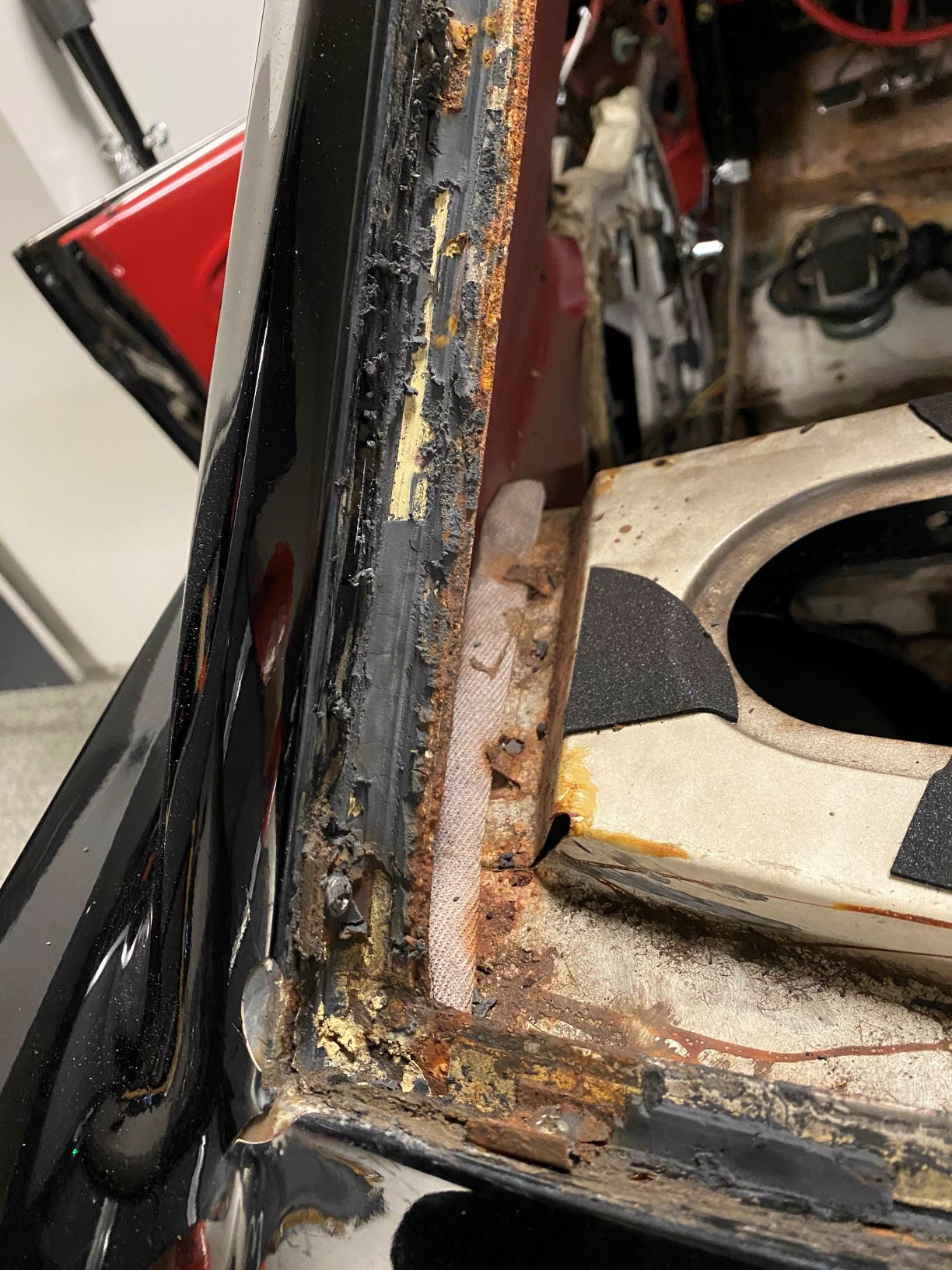 With the trim removed I was able to run a box knife through the gasket around the edge of the window then gently press the window out off the car from the interior. I’m fairly confident that the window and sealant was original to the car, the next photo is a closeup of what I was fighting with.