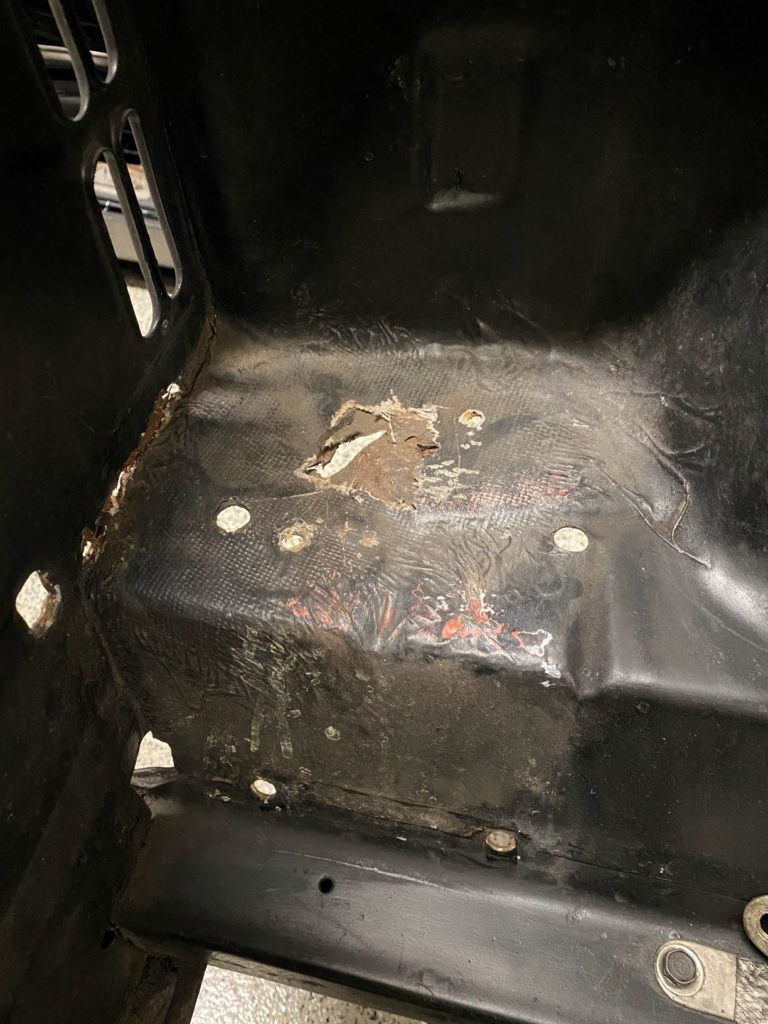 As I was removing miscellaneous components in the engine bay I came across another set of fiberglass patches underneath the battery tray, a common problem area on these cars due to damage from battery acid.