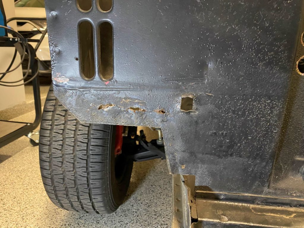 These patches were much more solidly adhered than the ones in the trunk had been so I decided to leave them mostly intact for now, the eventual media blasting should take care of them. The next picture shows the rust holes from the underside of the battery tray through to the front of the engine bay.