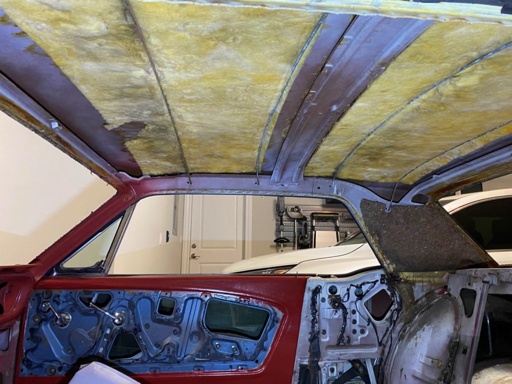 One interesting thing that I found while removing the headliner was that the rearmost 6 inches or so on each of the C-pillars were wound several times around a thin piece of wood which was then clamped down to the rear shelf by metal tabs.