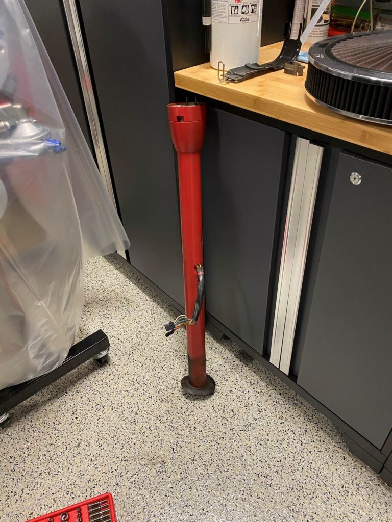Once the pitman arm was disconnected I asked Amara to join me in the garage to help support the steering column from the inside of the car. With her help keeping the column steady I removed the supports under the dash and then we were able to slowly twist the column up and off of the steering shaft. From there it was a quick three bolts and some careful maneuvering to get the shaft clear of the interior and out through the engine bay.