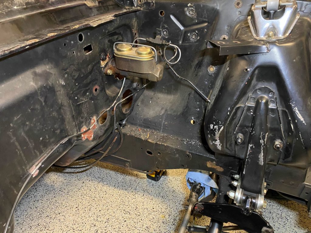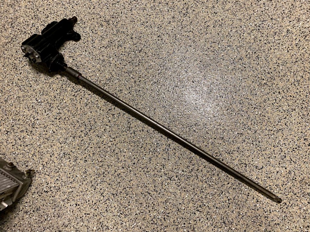 The first target of the day was the steering shaft and column. In the picture below the black “box” with the steel plate on top is the steering box. On the bottom it connects to the pitman arm in order to drive the control valve back and forth, on the other end a steel steering shaft extends all the way into the interior where the steering wheel is ultimately mounted. Because the steering shaft is a long steel rod aimed squarely at the driver’s upper torso it’s often lovingly referred to as a “spear”.