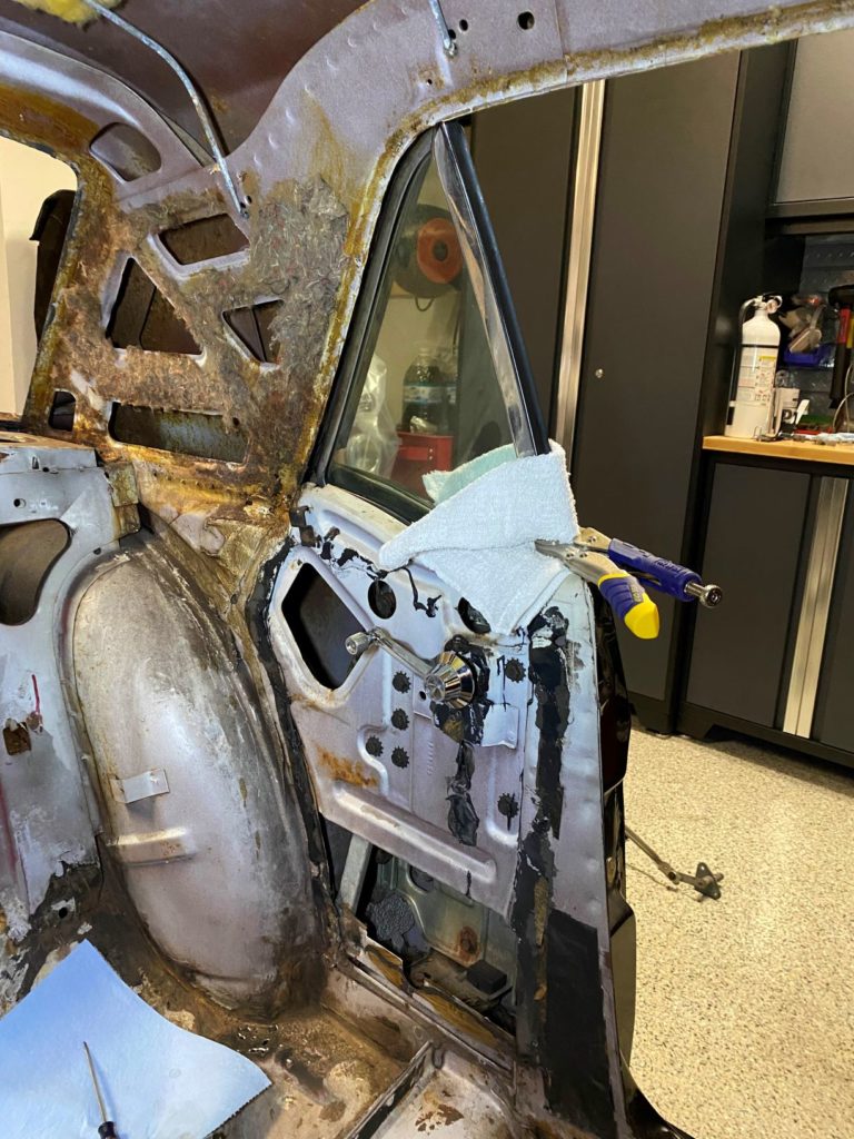 Adding to the adventure is the fact that the sheet metal design of the interior panels means that certain aspects of the window mechanisms are only accessible at certain glass positions, hence the vice grips keeping the free-floating window elevated at the top of its tracks in the photo below.
