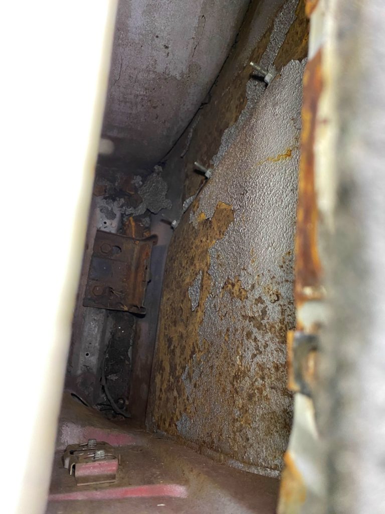 With the glass and window assembly removed I was able to access the three retaining nuts that keep the chrome quarter panel trim attached. The following picture is taken looking down into the slot that the window would typically roll up out of and the three studs can be seen protruding into the cavity.