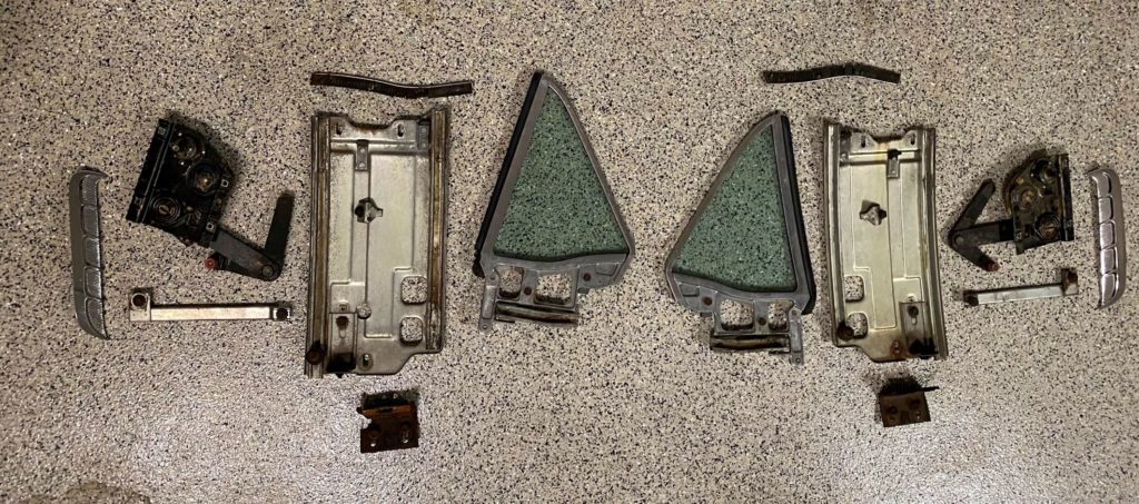 From left to right: chrome quarter panel exterior trim, window regulator (top), interior regulator track (bottom), outer felt guide (top), window track panel (middle), window track bottom bracket (bottom), quarter glass, then all the same items in reverse for the driver’s side