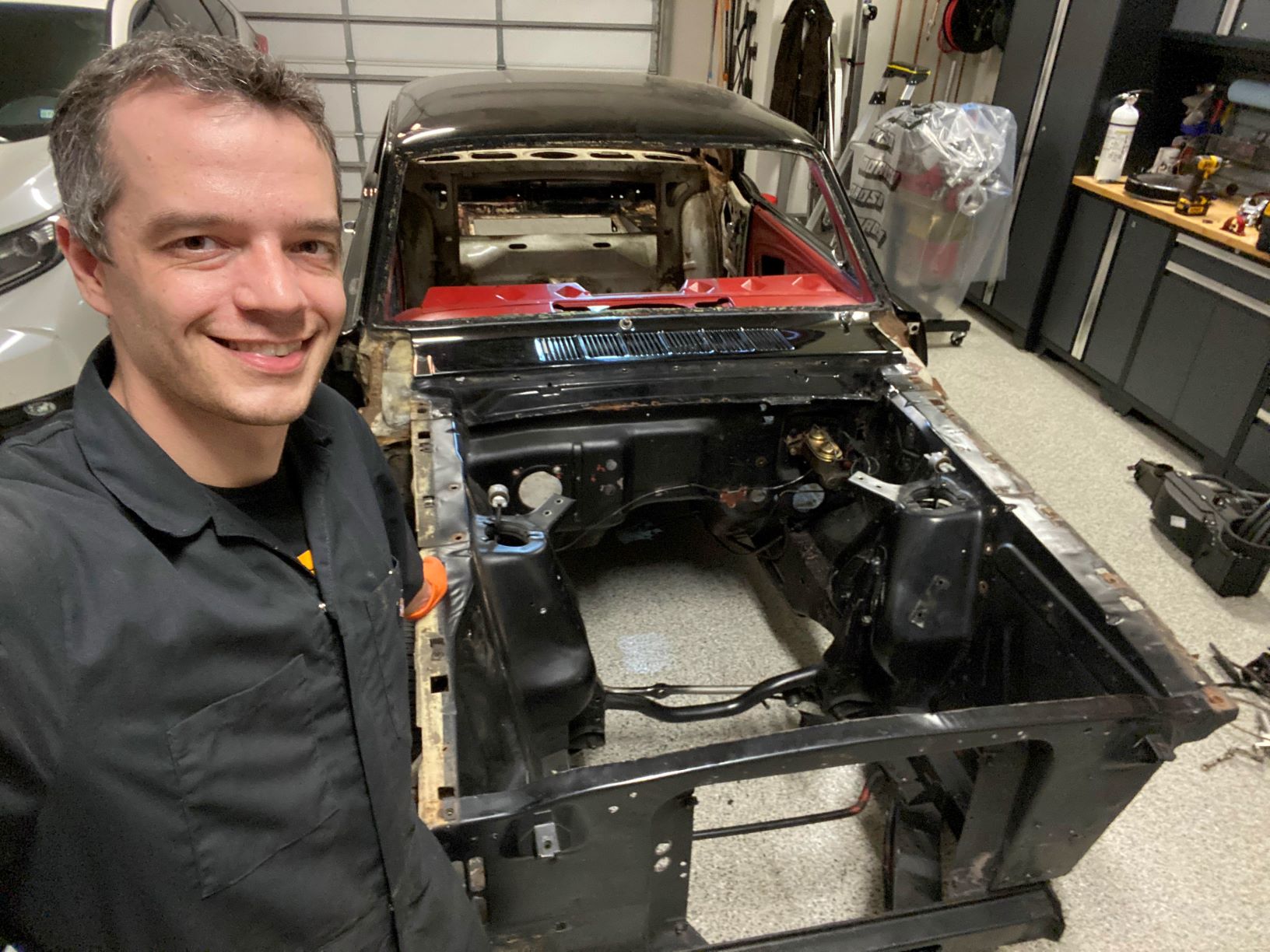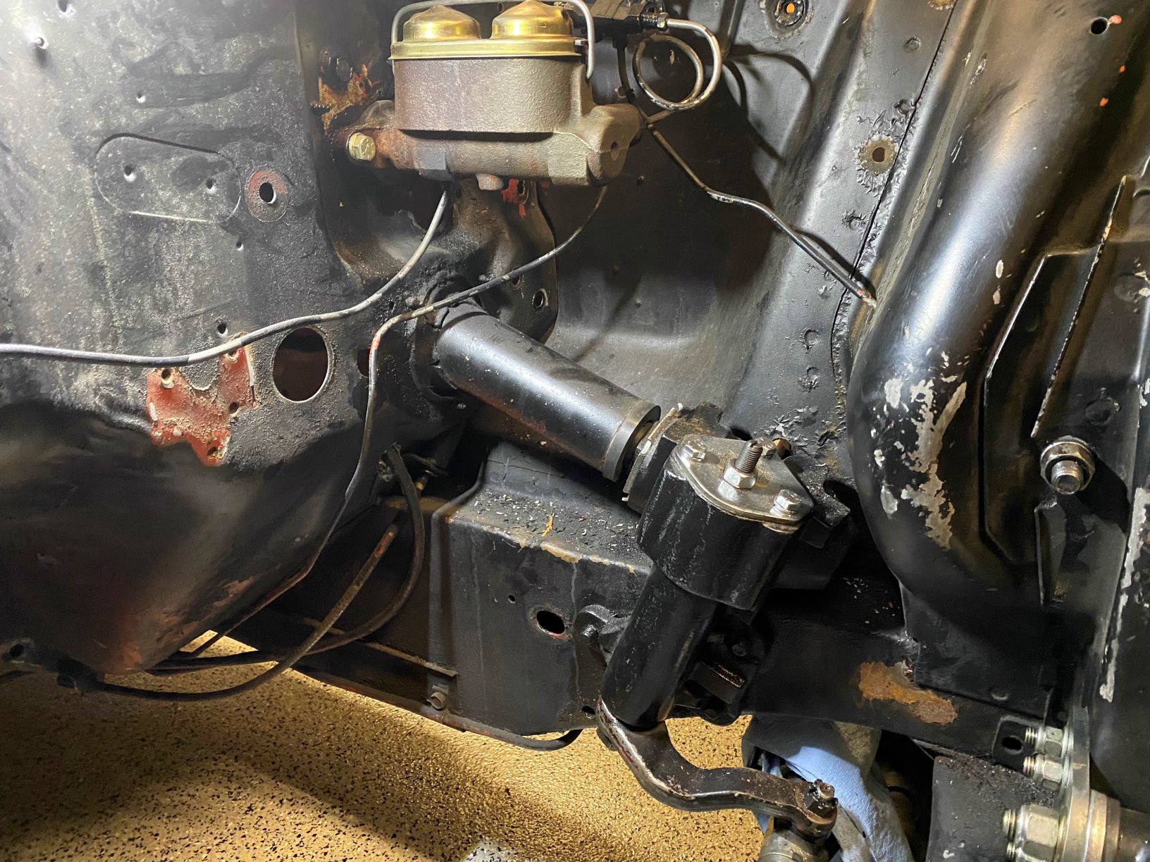 The first target of the day was the steering shaft and column. In the picture below the black “box” with the steel plate on top is the steering box. On the bottom it connects to the pitman arm in order to drive the control valve back and forth, on the other end a steel steering shaft extends all the way into the interior where the steering wheel is ultimately mounted. Because the steering shaft is a long steel rod aimed squarely at the driver’s upper torso it’s often lovingly referred to as a “spear”.