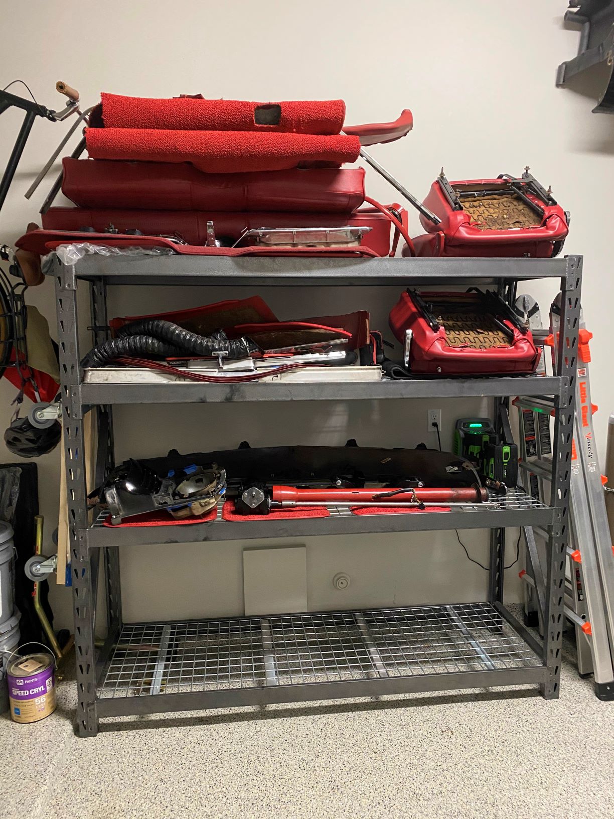 At the end of the day I took some time to re-organize the parts on the metal shelving so that the bottom shelf will be able to serve as a home for the rear end housing and leaf springs once they are relieved of their current duties.