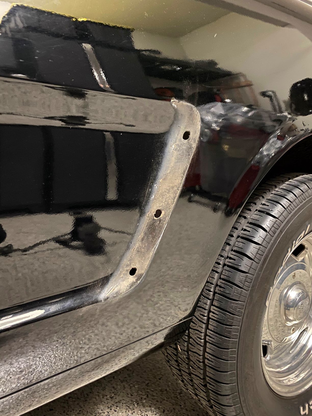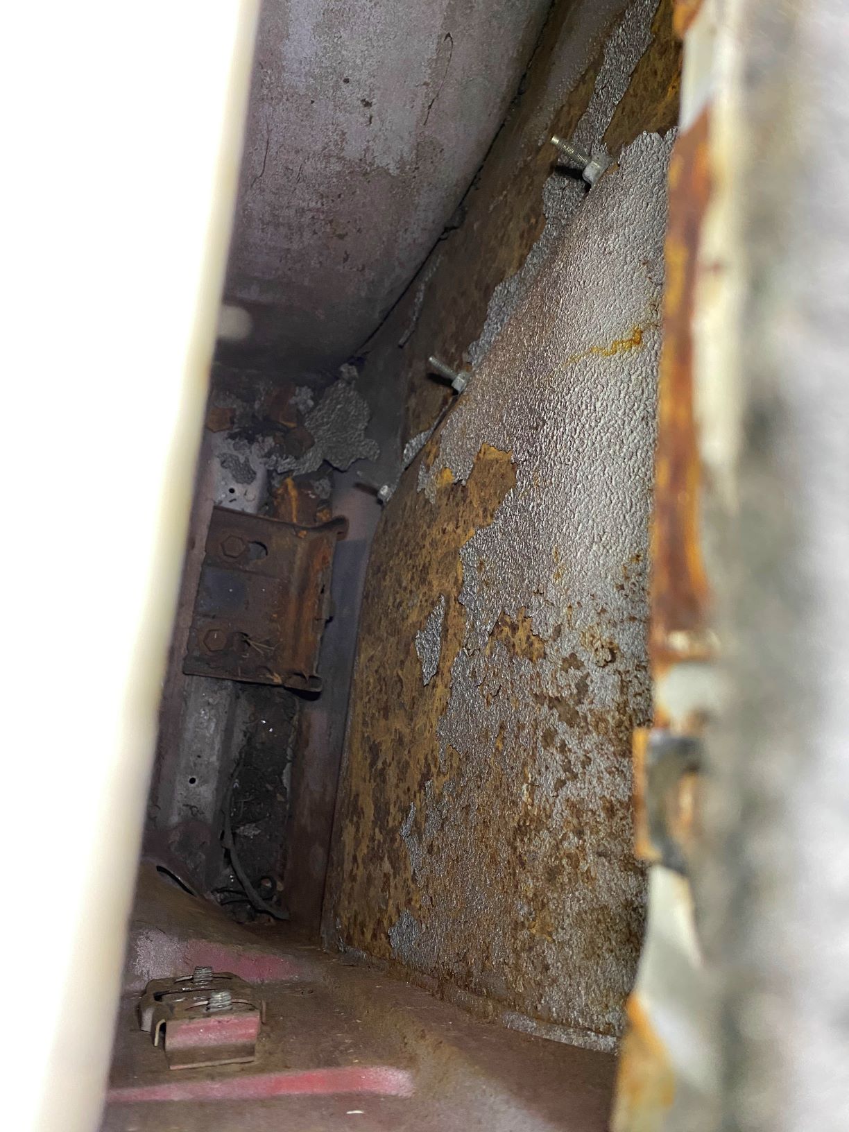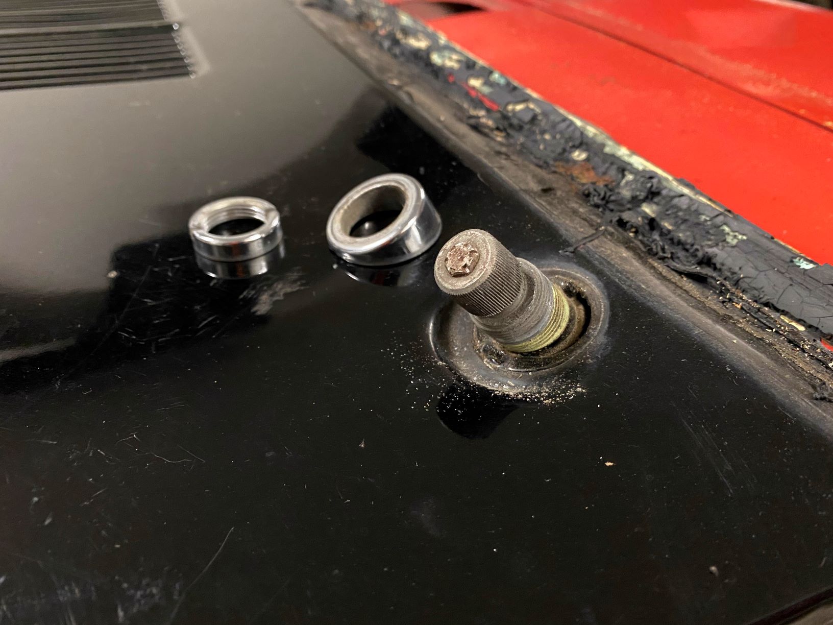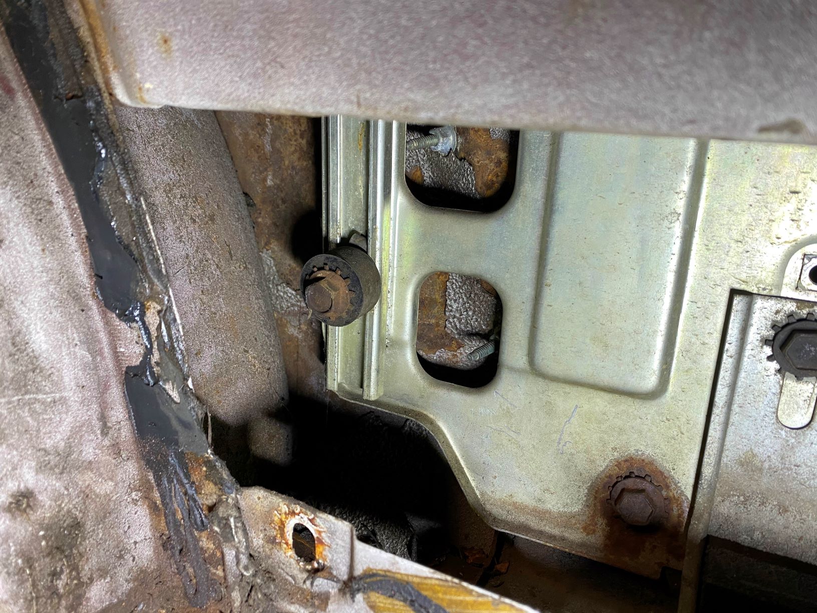 With the glass and window assembly removed I was able to access the three retaining nuts that keep the chrome quarter panel trim attached. The following picture is taken looking down into the slot that the window would typically roll up out of and the three studs can be seen protruding into the cavity.