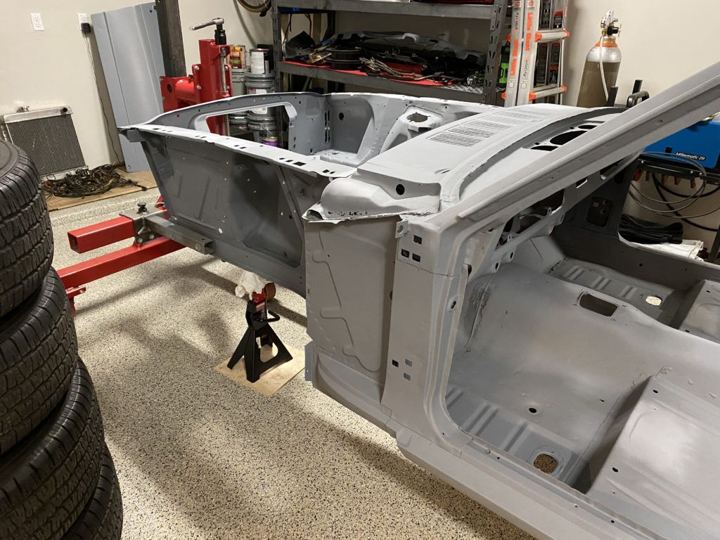 I hadn’t left quite enough room for the rotisserie to be moved out from in front of the chassis so I carefully used some wood and a floor jack to shimmy the chassis further to one side of the bay.