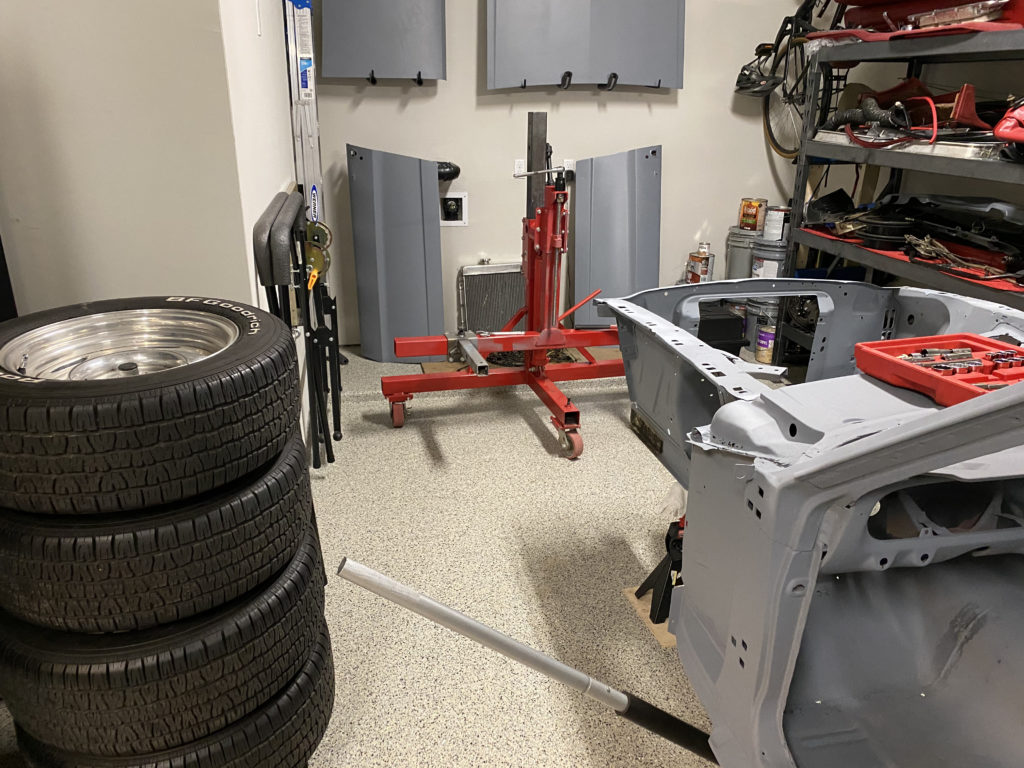 My goal was to get the chassis on the ground as far back in the garage as possible, ideally far enough that I could still fit all three vehicles in the garage. This was a little tricky because the back bay of the garage is fairly narrow and the rotisserie segments aren’t small, meaning that I was going to need to get the front of the chassis unmounted far enough out that the rotisserie segment could still be removed and then move the chassis further back into the bay.