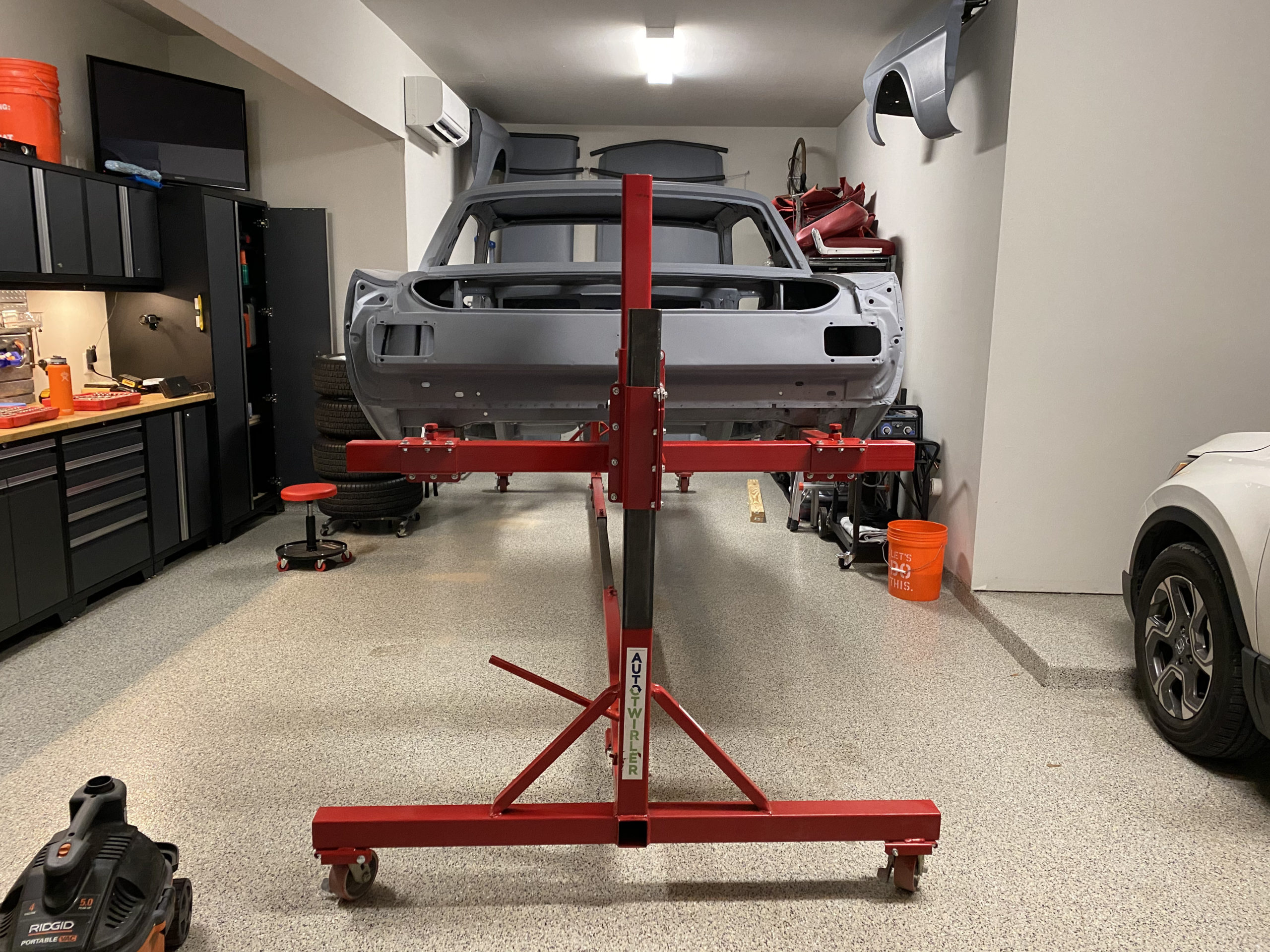 My goal was to get the chassis on the ground as far back in the garage as possible, ideally far enough that I could still fit all three vehicles in the garage. This was a little tricky because the back bay of the garage is fairly narrow and the rotisserie segments aren’t small, meaning that I was going to need to get the front of the chassis unmounted far enough out that the rotisserie segment could still be removed and then move the chassis further back into the bay.