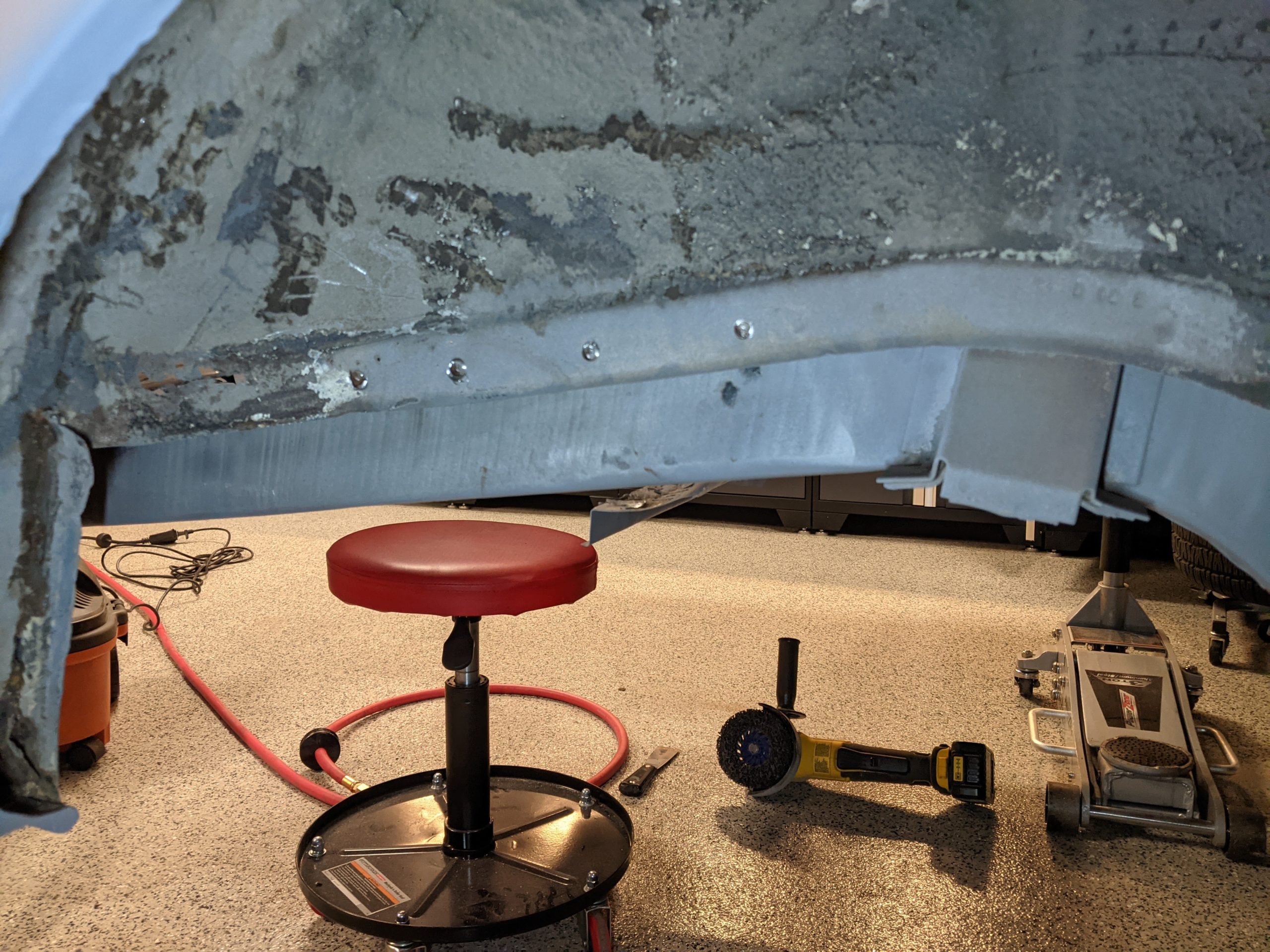 Pulling that free revealed a fair amount of rust at the seams of the outer wheel housing and at both the bottom and rear of the quarter panel. To-do list expanded.