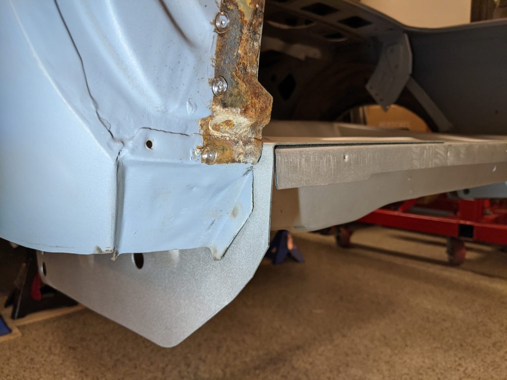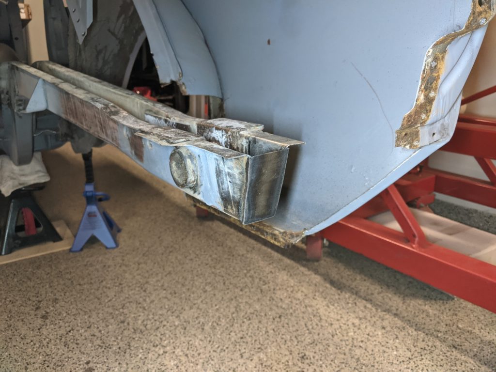 While testing the fit of the new trunk floor it became apparent that the assembly was sitting about half an inch too far towards the rear of the car. The limiting factor in the forward movement was the interaction between the piece under the rear of the trunk and the end of the frame rails that it rests against. Ultimately I decided that I was going to modify both piece of the equation – slice and slightly bend out potions of the rear panel under the trunk and shorten the frame rails slightly due to the condition of the rear tabs requiring replacement anyway.