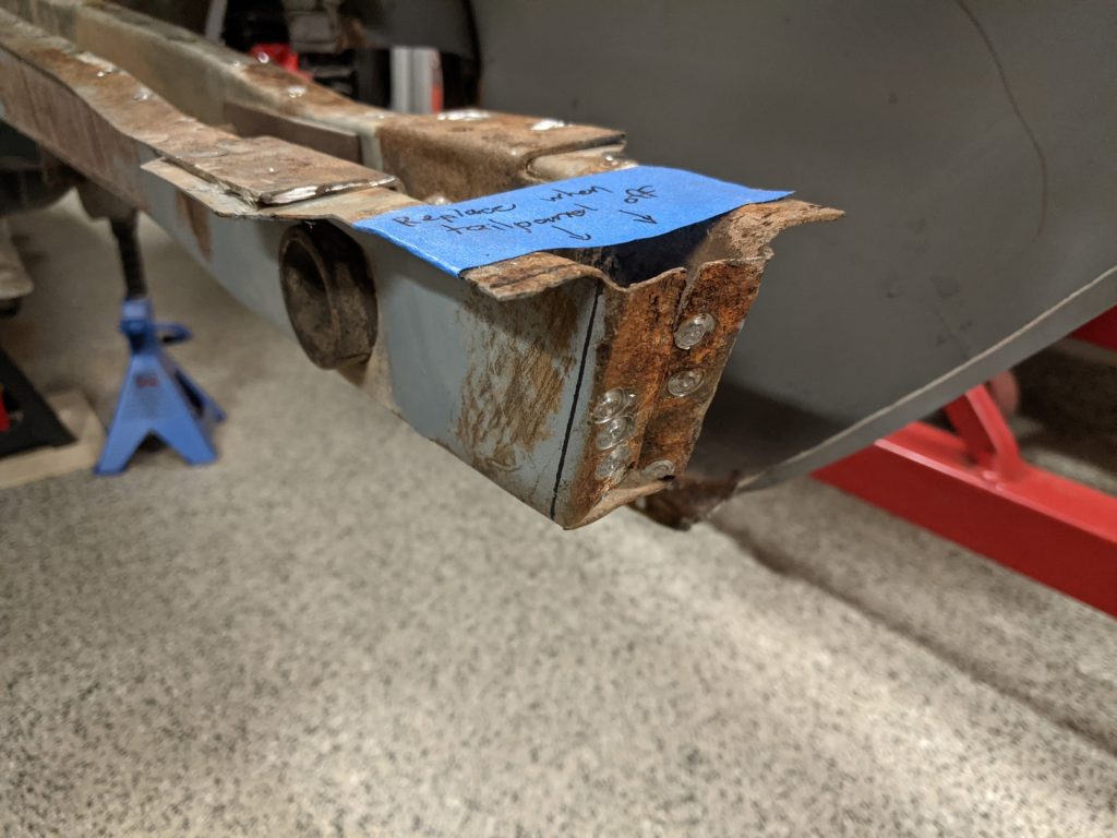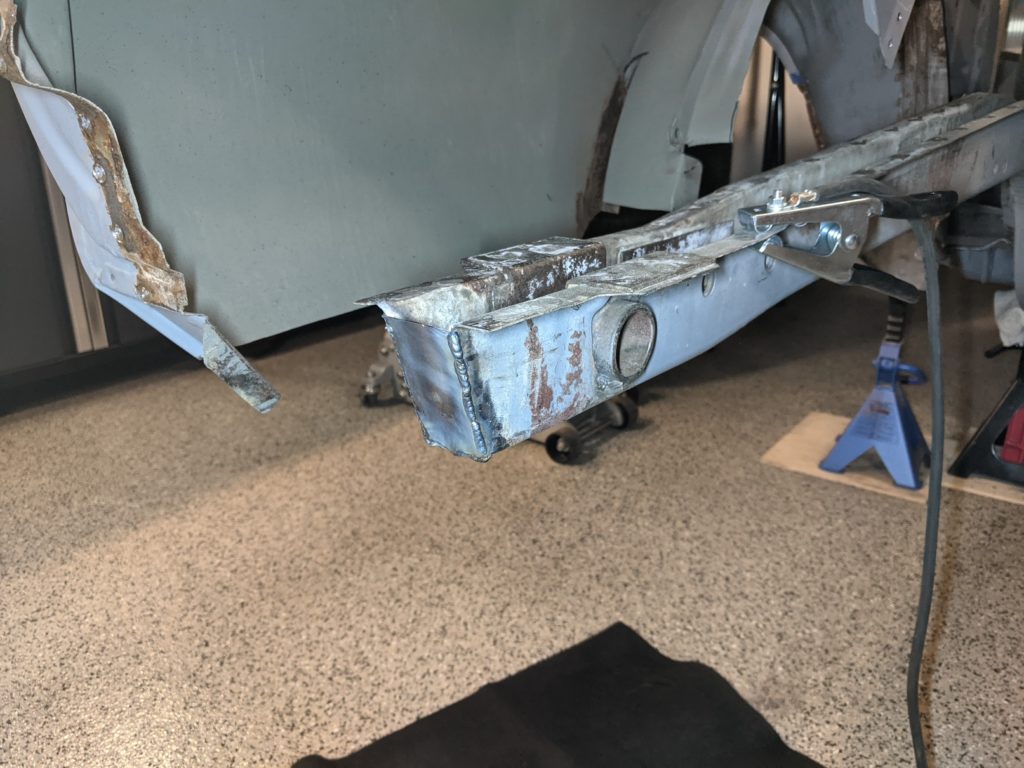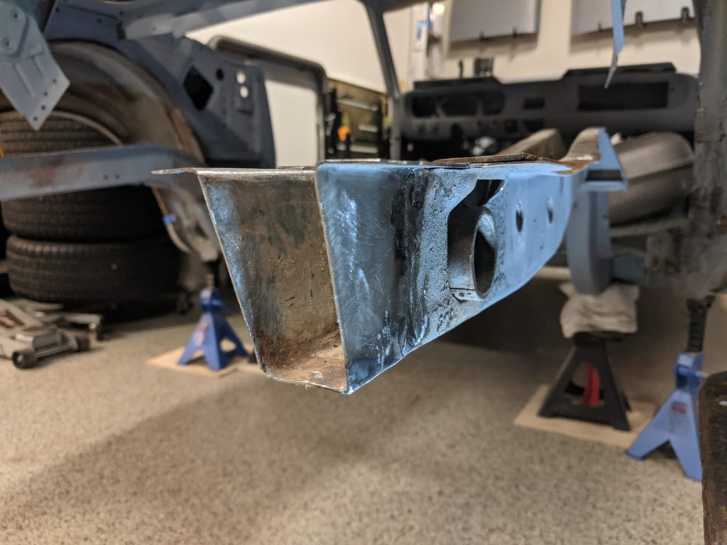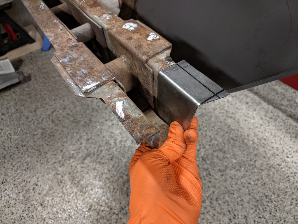 I started off by cutting the original rear-facing tabs off of both frame rails as they showed a fair amount of rust damage and moving them back by a fraction of an inch would present me with some of the forward clearance the new trunk required.
