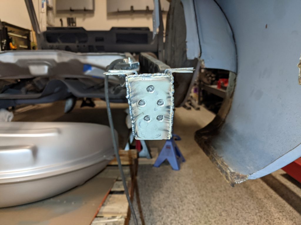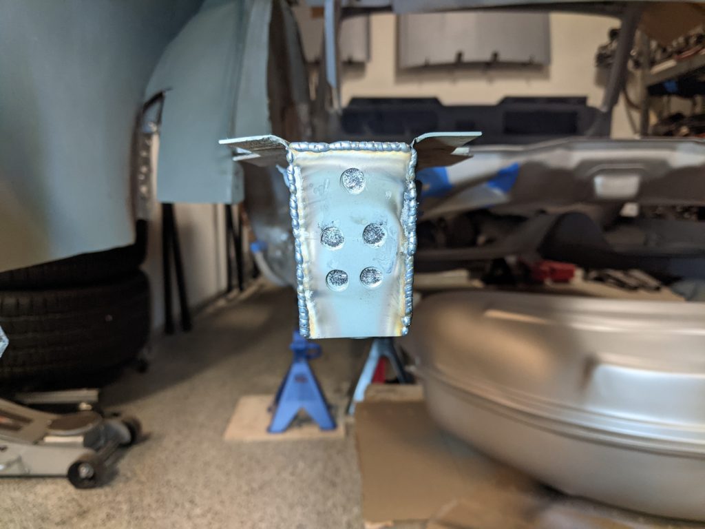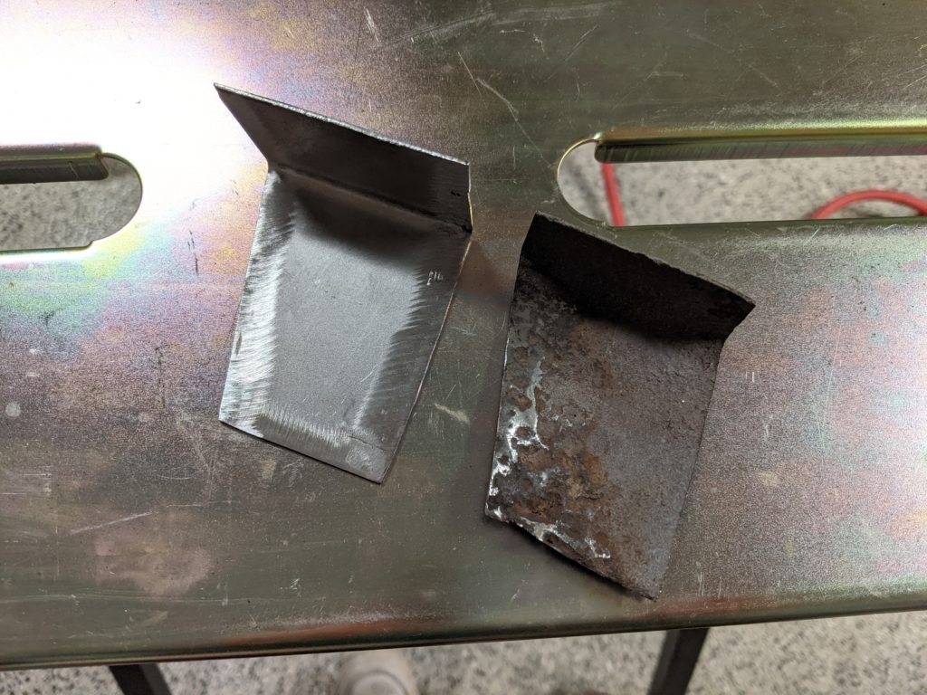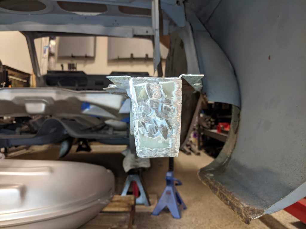 With the patch in place I went about fitting and welding in replacements for the recently excised rear tabs. I opted for a flat sheet of metal rather than trying to replicate the original tabs which had been a result of the way the frame rail was originally formed.