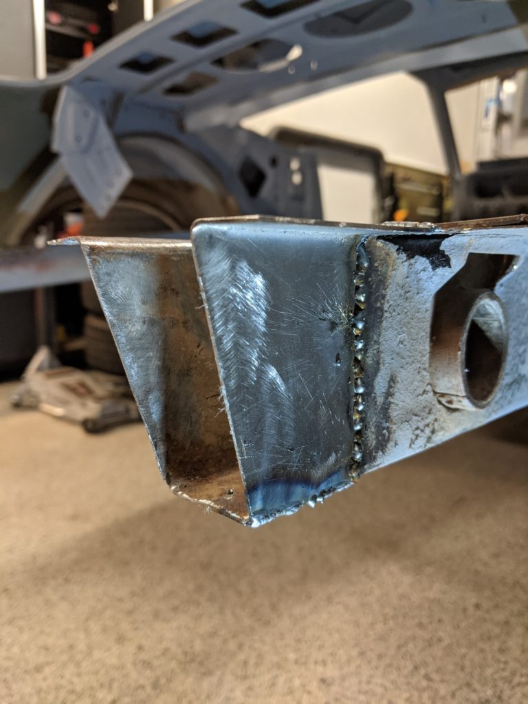 After mocking up the trunk floor again I found that I had slightly overshot the additional forward clearance the trunk needed to align properly with the rear of the quarter panels. To push the trunk back out slightly I cut shims to match the rear of the frame rails and welded them in place.