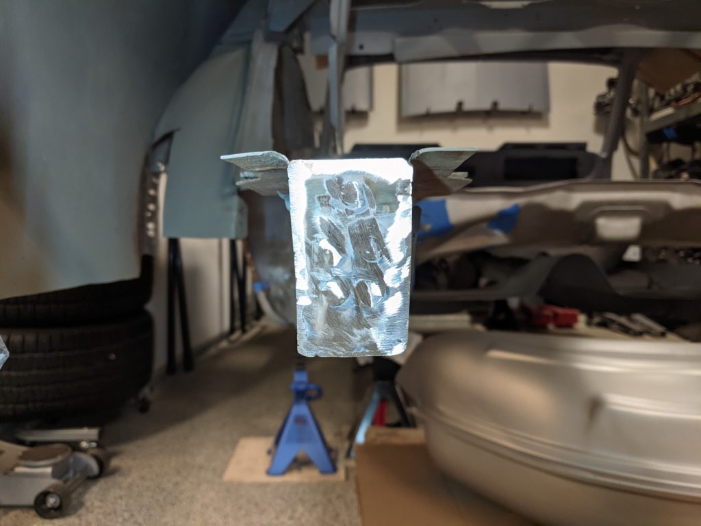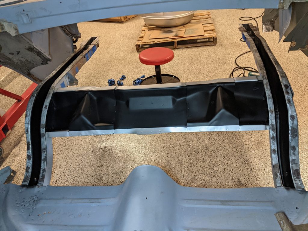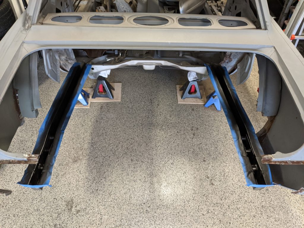 Once the flanges and new metal was looking good I taped off the already-painted interiors of the frame rails so that I could spray a couple coats of primer on the flanges where they would mate with the new trunk floor. With that the frame rails were finally ready to have the new trunk floor welded to them.