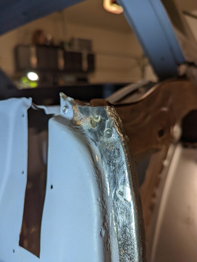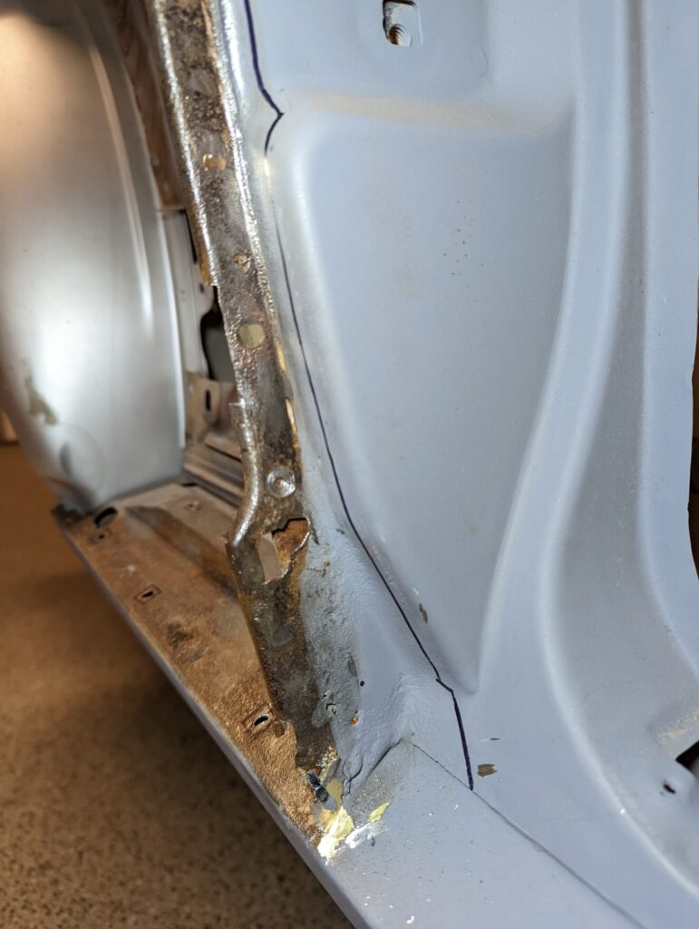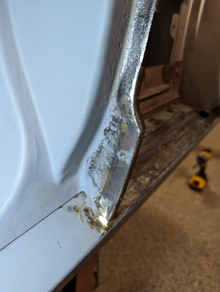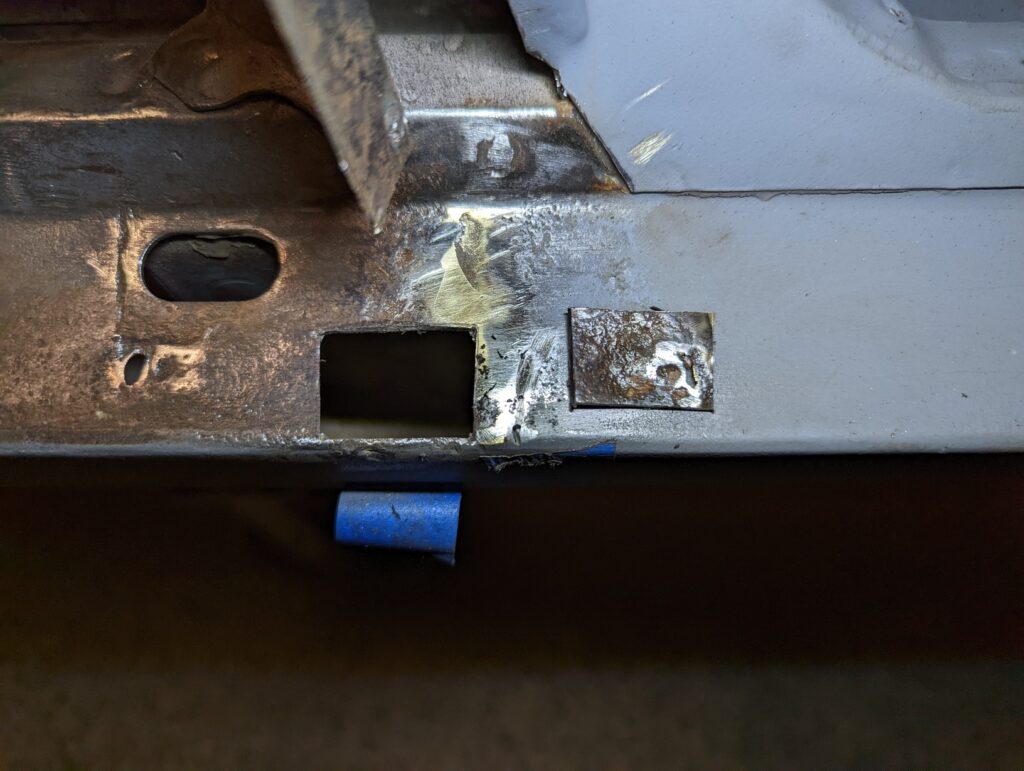 One difference on the passenger side was that there was a small section of significant rust damage where the B pillar met the top of the rocker. Using a Dremel I excised the offending area and welded in a small patch.