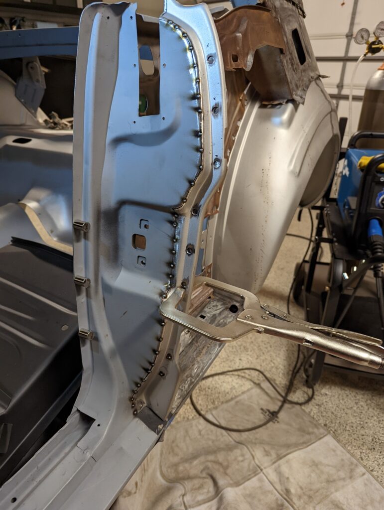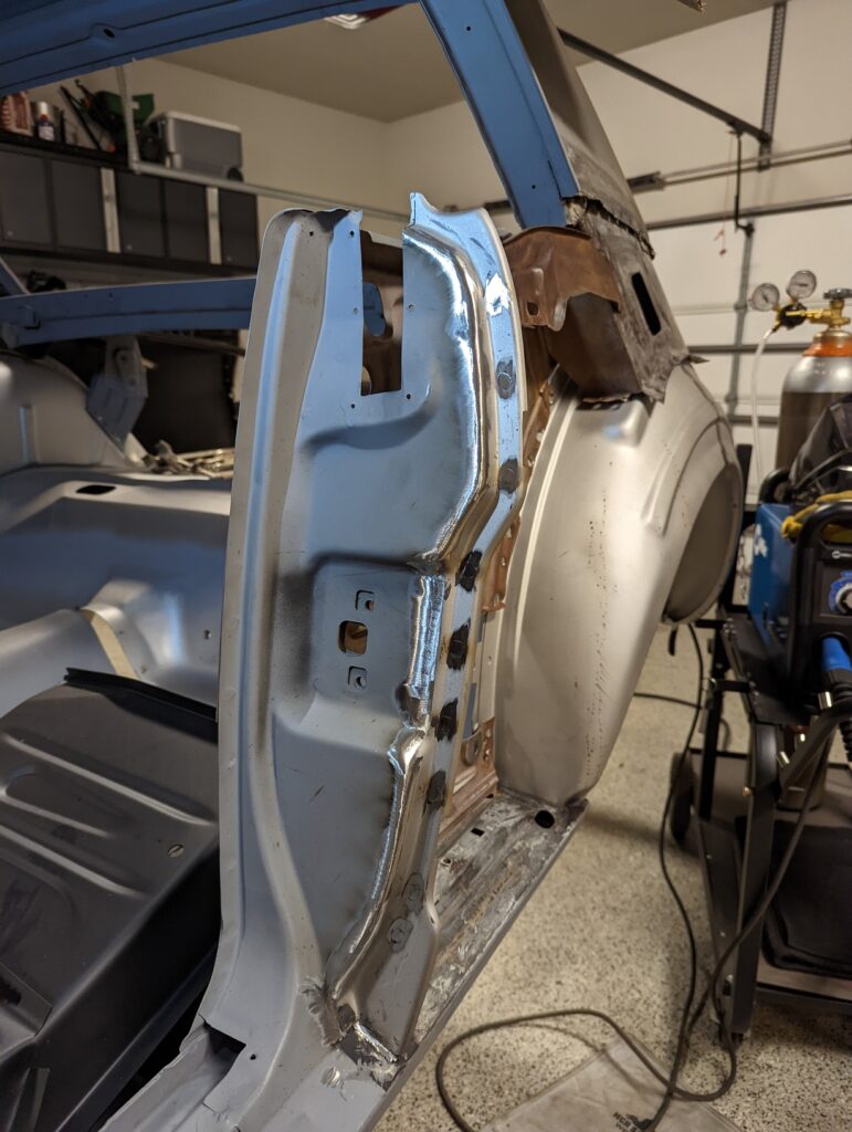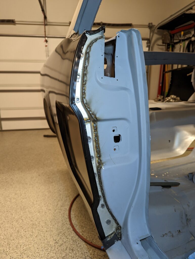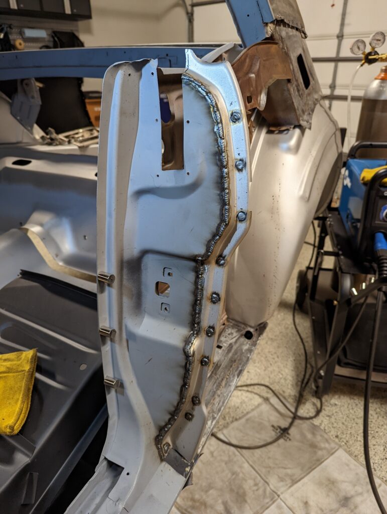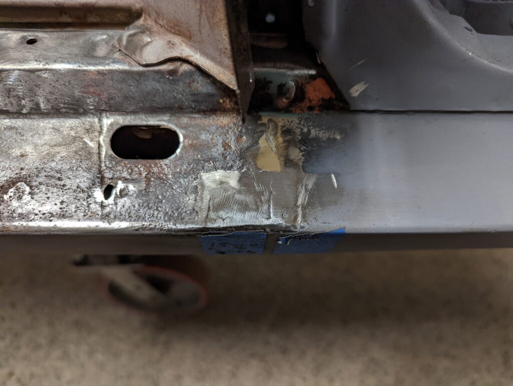The passenger quarter panel had been re-skinned at some point in the car’s life and whoever did the work tore the bottom side of the quarter panel off the rocker rather than cutting it, leaving holes in the rocker where the welds were. I took the opportunity to weld up all of those holes.