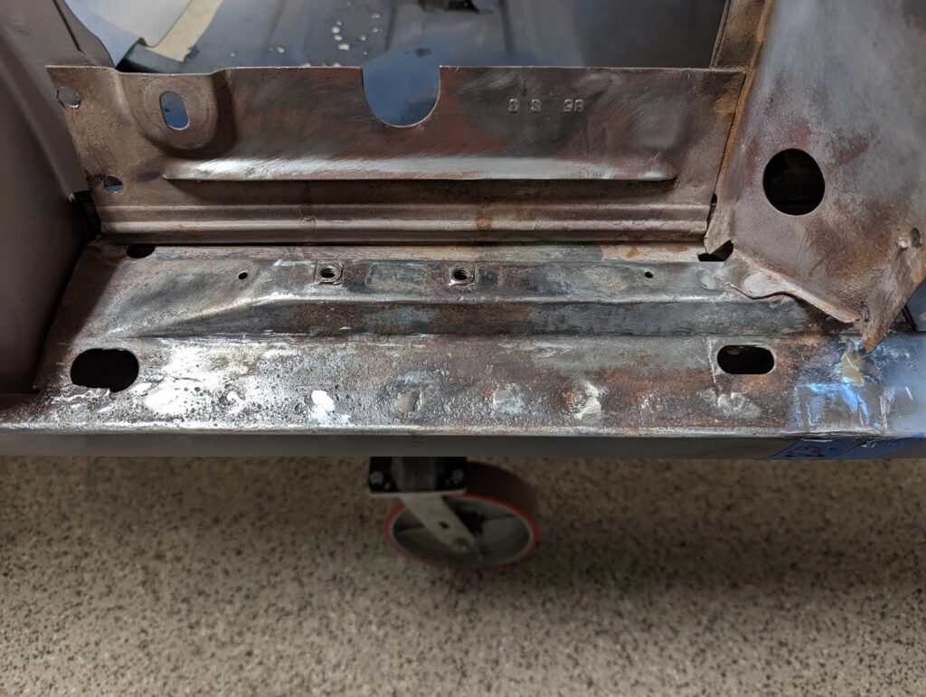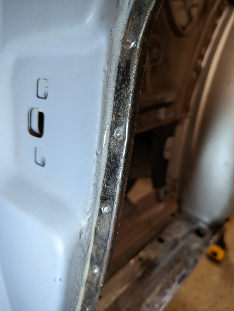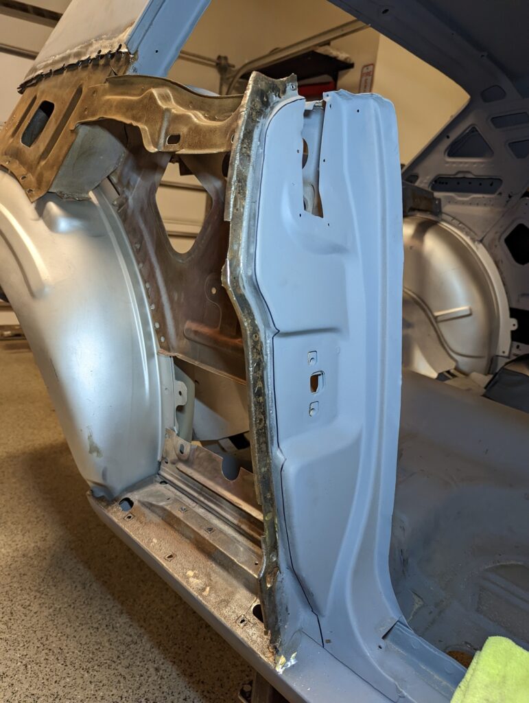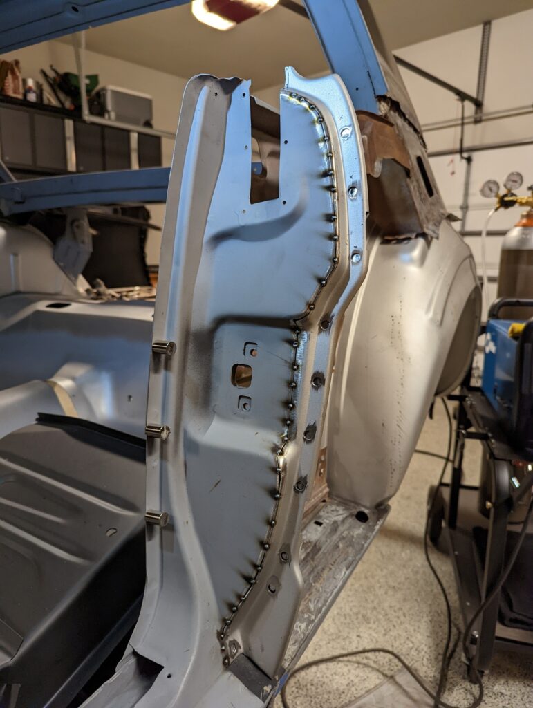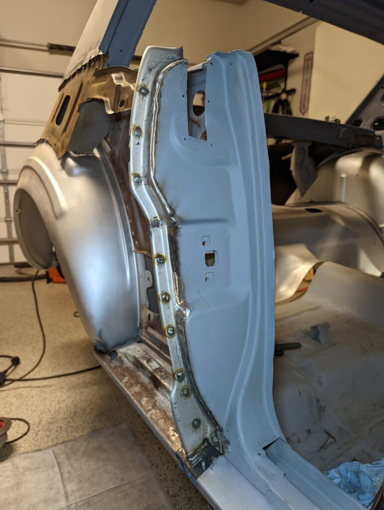 The passenger quarter panel had been re-skinned at some point in the car’s life and whoever did the work tore the bottom side of the quarter panel off the rocker rather than cutting it, leaving holes in the rocker where the welds were. I took the opportunity to weld up all of those holes.