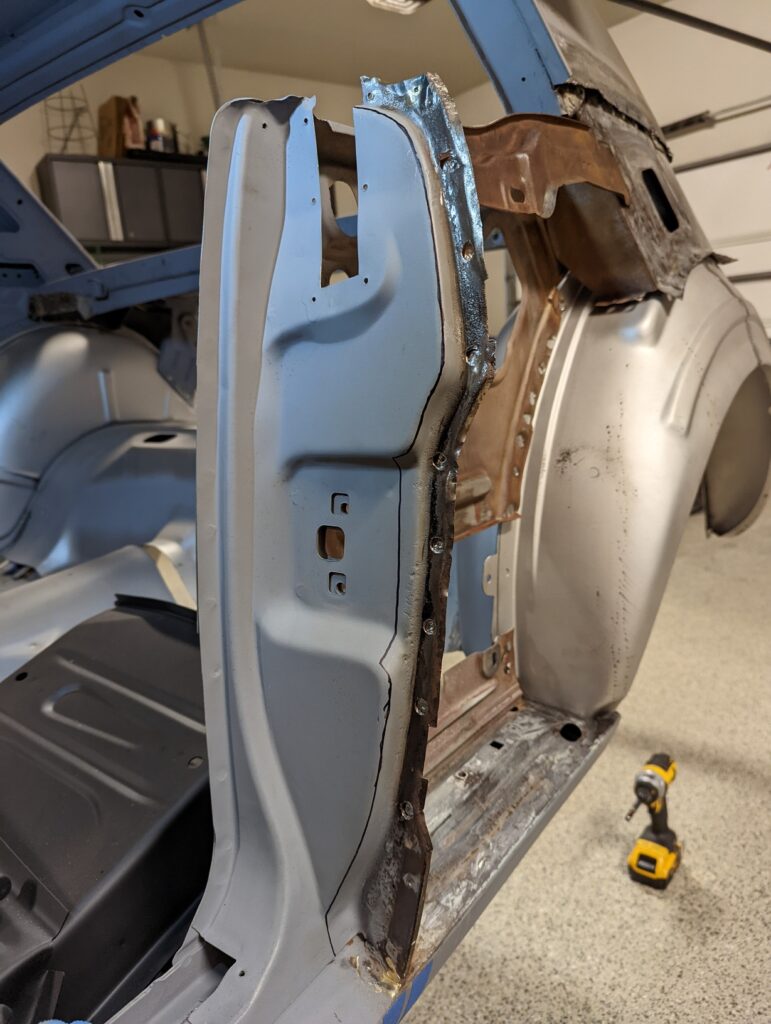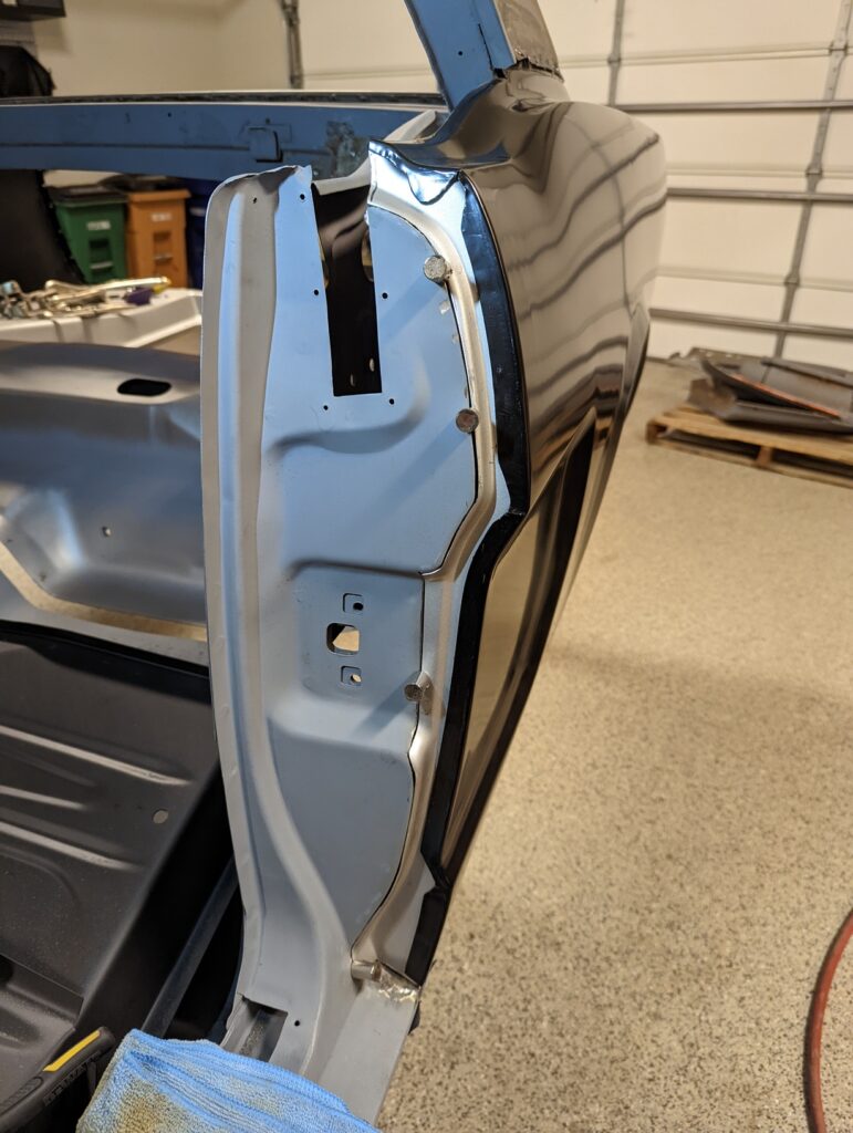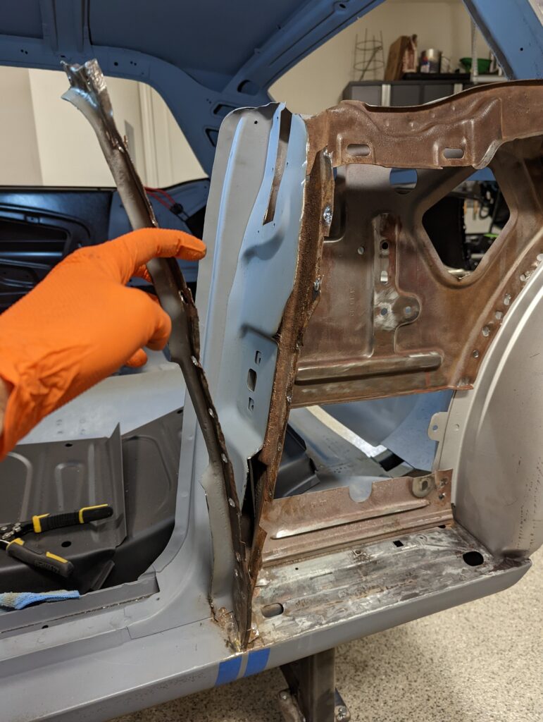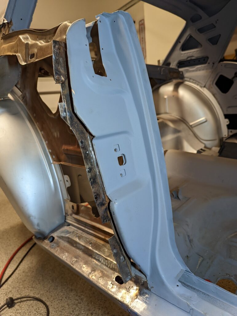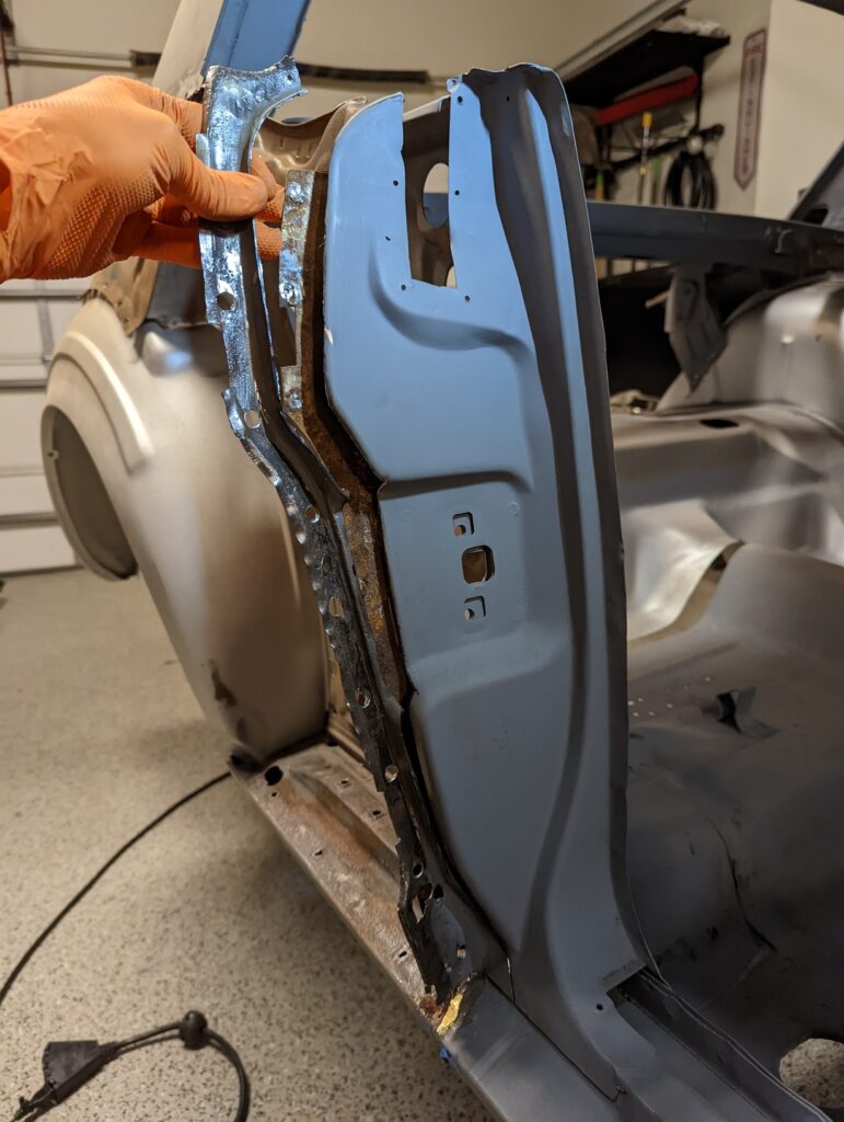 I was pretty conflicted about what to do with the B pillars. While they appeared largely solid, each side showed rust pitting and damage on the outside flange where they met the quarter panel. Since the damage was isolated I didn’t want to replace the entire assembly and have to deal with making sure to get everything lined back up perfectly to maintain the proper gap and angles between the door and quarter panel. On the other hand the sections that were damaged were full of tight bends and contours that I was unlikely to be able to faithfully replicate myself in any reasonable amount of time. Ultimately I decided it was worth it to order full reproduction B pillars just to be able to cut off and use the outside flanges as replacements.