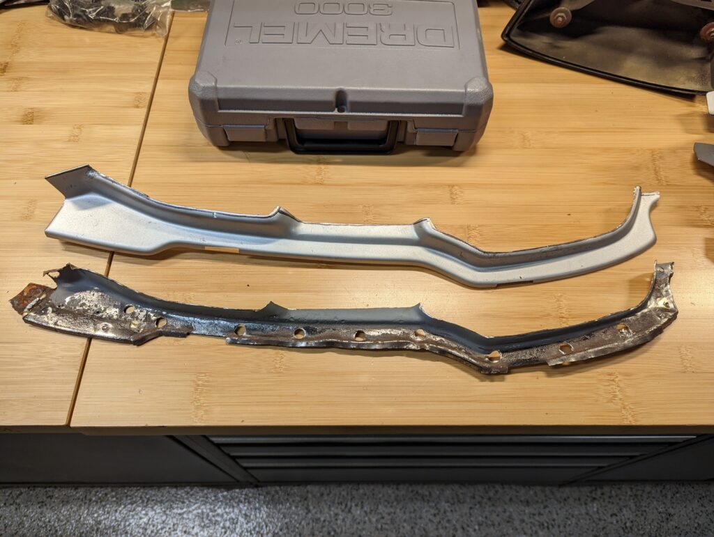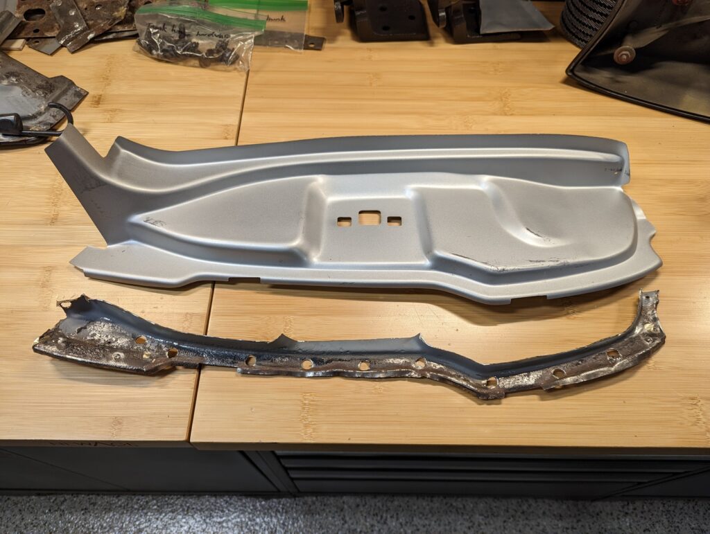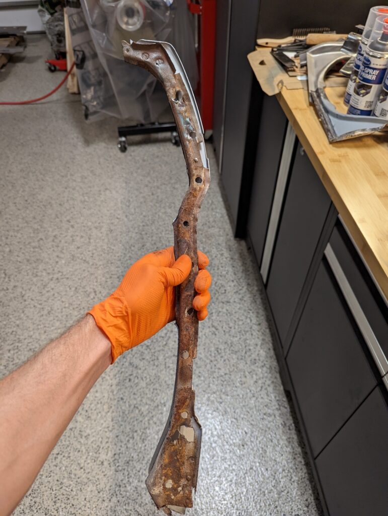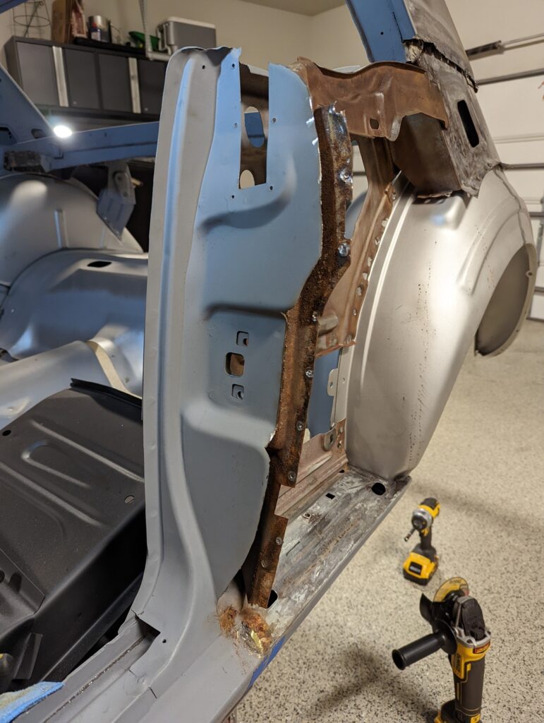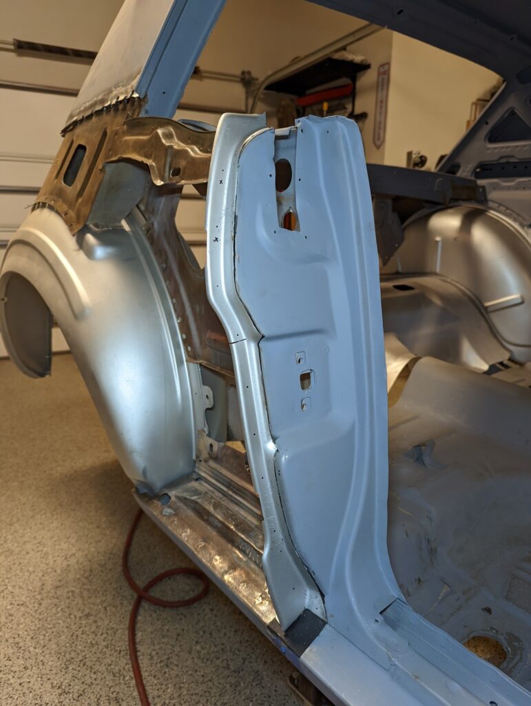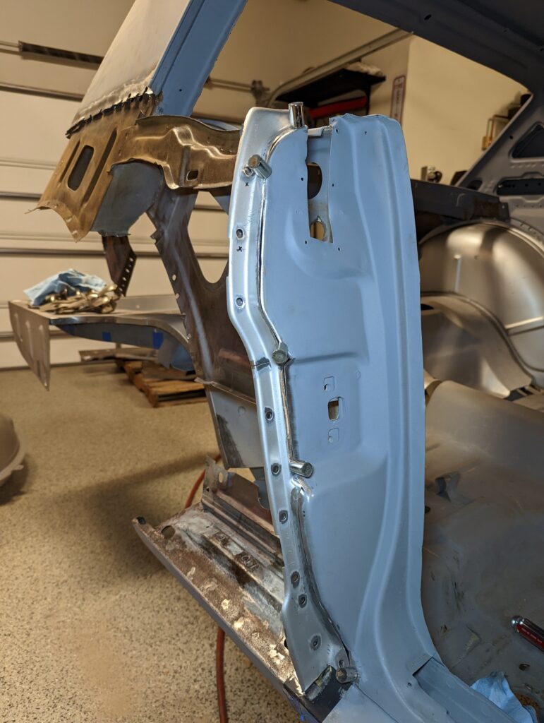I was pretty conflicted about what to do with the B pillars. While they appeared largely solid, each side showed rust pitting and damage on the outside flange where they met the quarter panel. Since the damage was isolated I didn’t want to replace the entire assembly and have to deal with making sure to get everything lined back up perfectly to maintain the proper gap and angles between the door and quarter panel. On the other hand the sections that were damaged were full of tight bends and contours that I was unlikely to be able to faithfully replicate myself in any reasonable amount of time. Ultimately I decided it was worth it to order full reproduction B pillars just to be able to cut off and use the outside flanges as replacements.