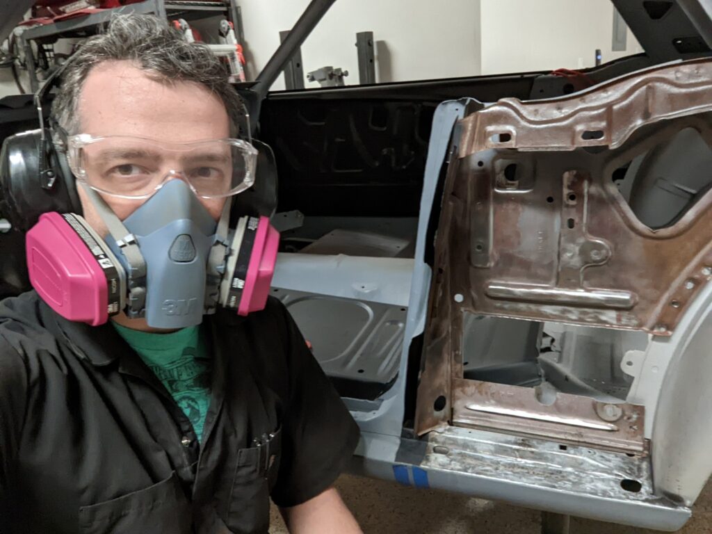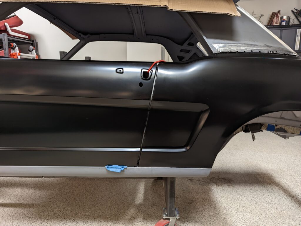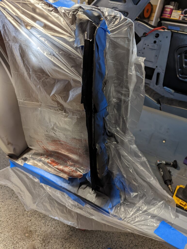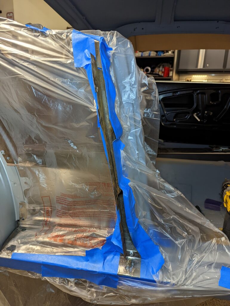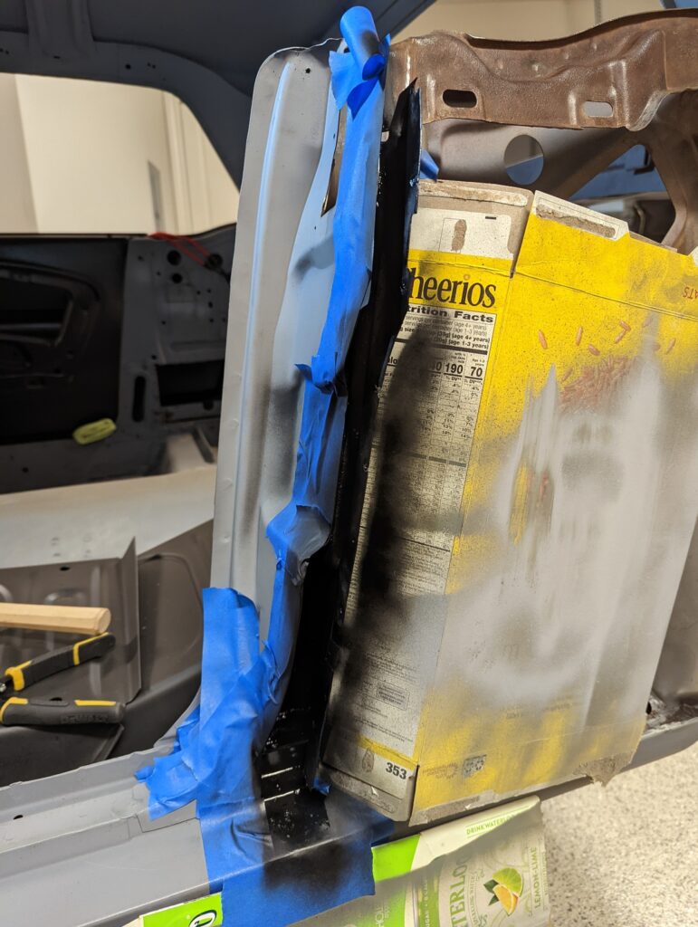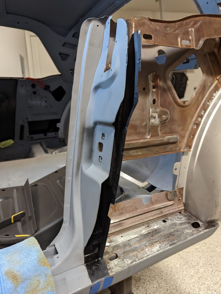 Satisfied with the fit I did a mediocre job of taping off the surrounding metal and sprayed rust encapsulator into the typically inaccessible interior of the B pillar.