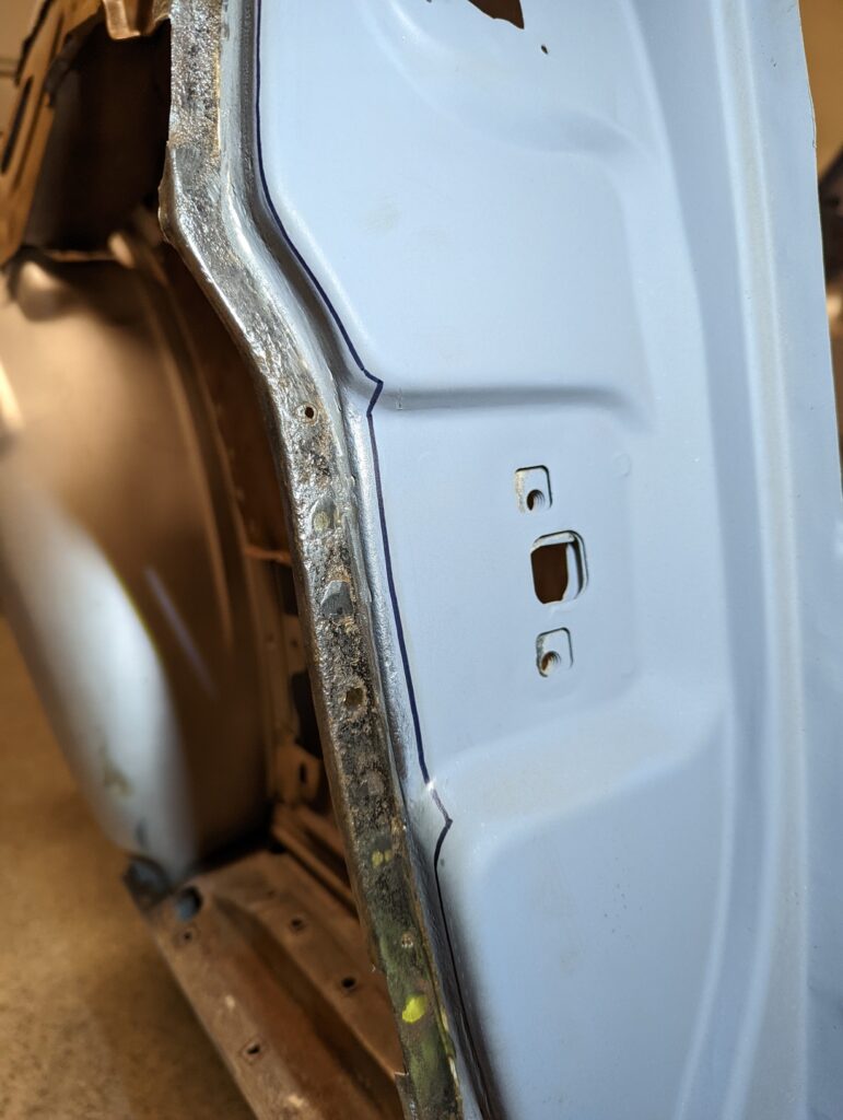 Before cutting anything I put tape on the underside of the rocker panel to indicate where the original flange had lined up to increase the odds that I’d be able to get the replacement back in the same spot.