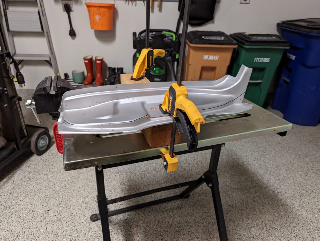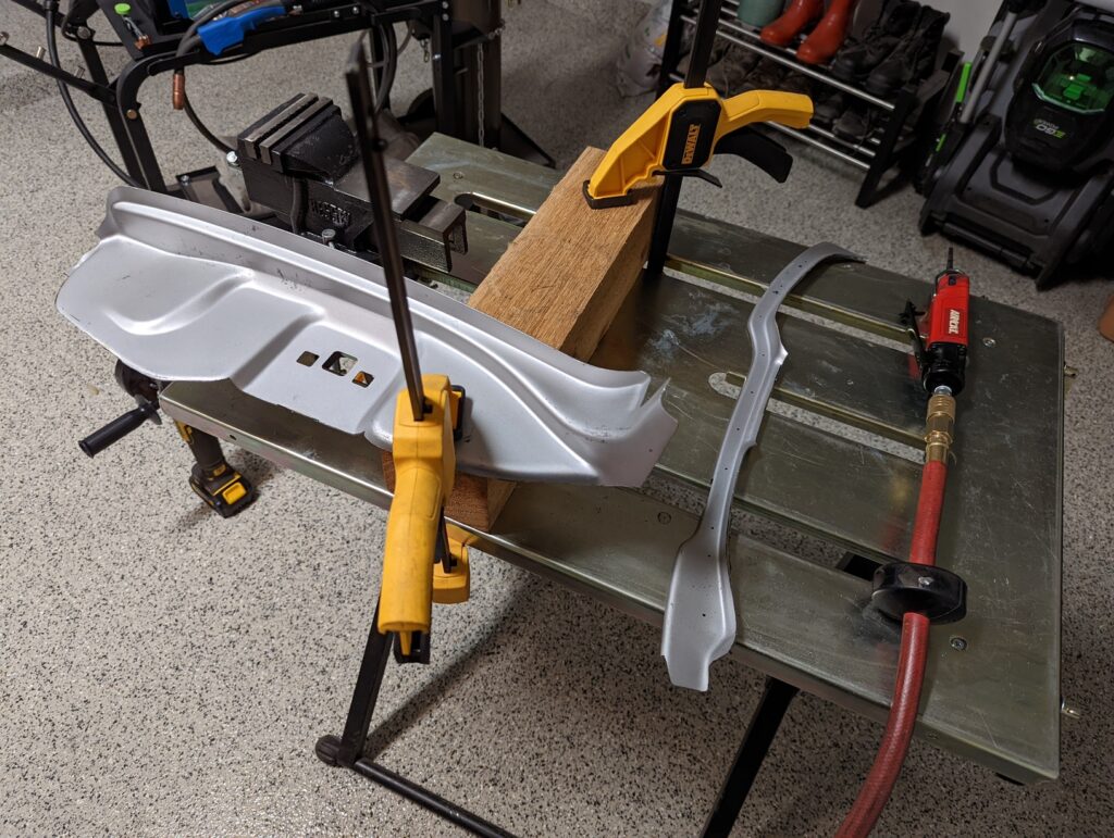After a couple hours of grinding to get the replacement fitting perfectly I used magnets to hold it in place while I verified the fit with the reproduction quarter panel.