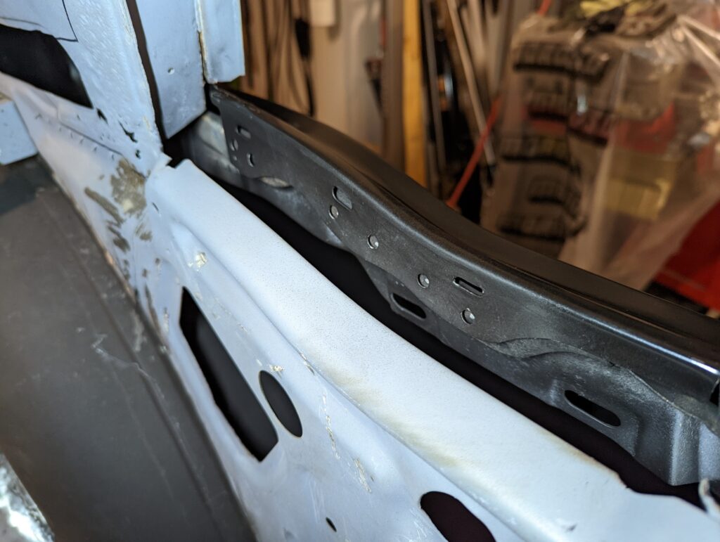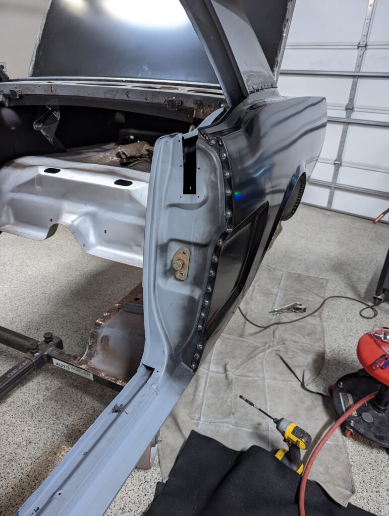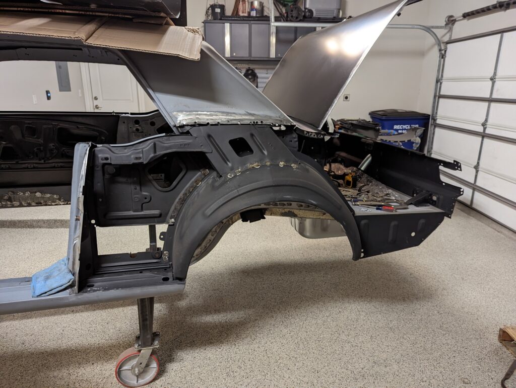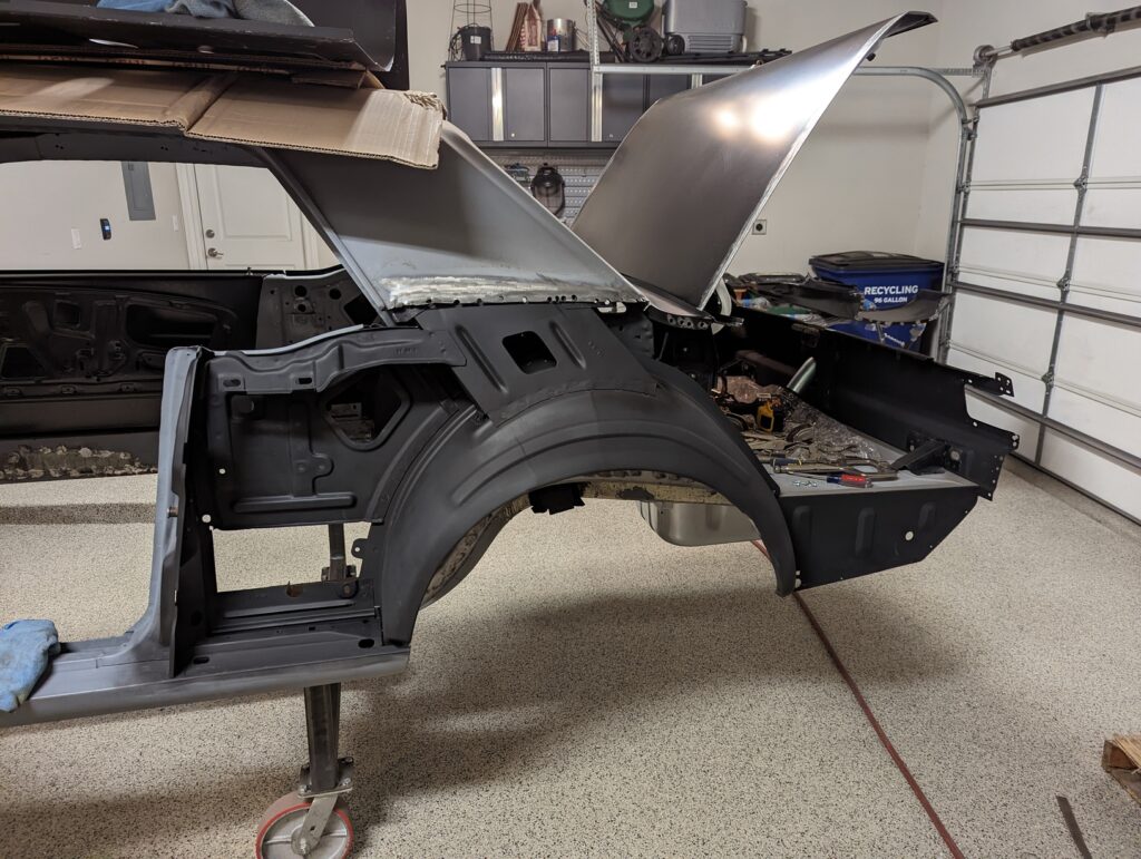 I test fit the quarter panel one last time so that I could mark out where the tricky welds on the inside of the quarter window support structure and the bottom of the quarter window channel would go, allowing me to grind those spots down to bare metal to prepare them for welding.