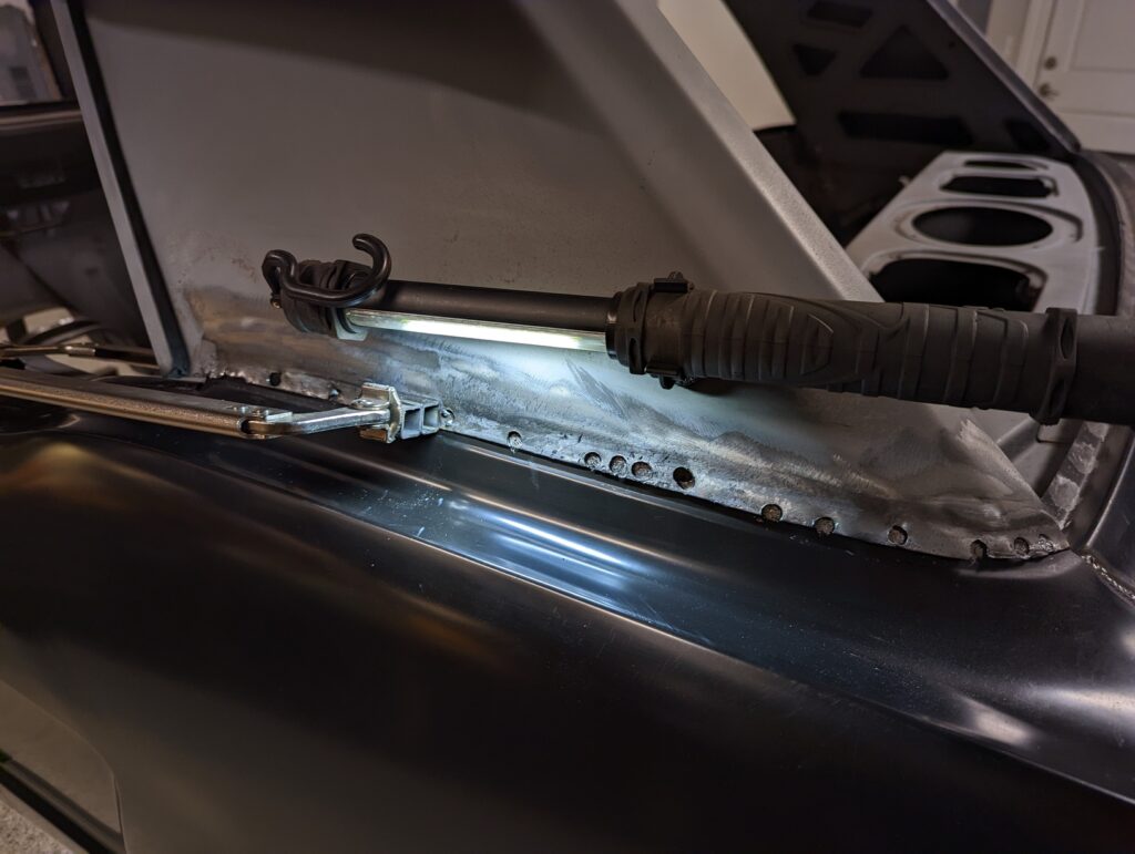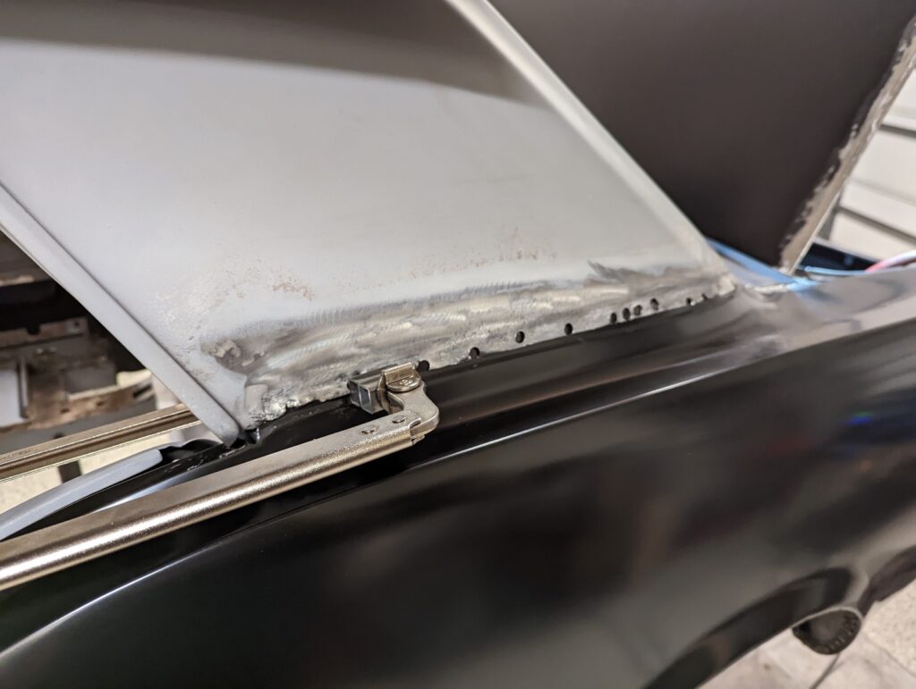 When the welding finally started I followed the same approach that I did on the passenger side in starting with the wheel arch, moving to the rear along the underside against the trunk drop off, moving back to the front flange that wraps around the edge of the B pillar, then tackling the sail panel seam.