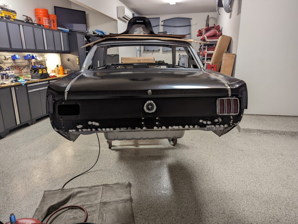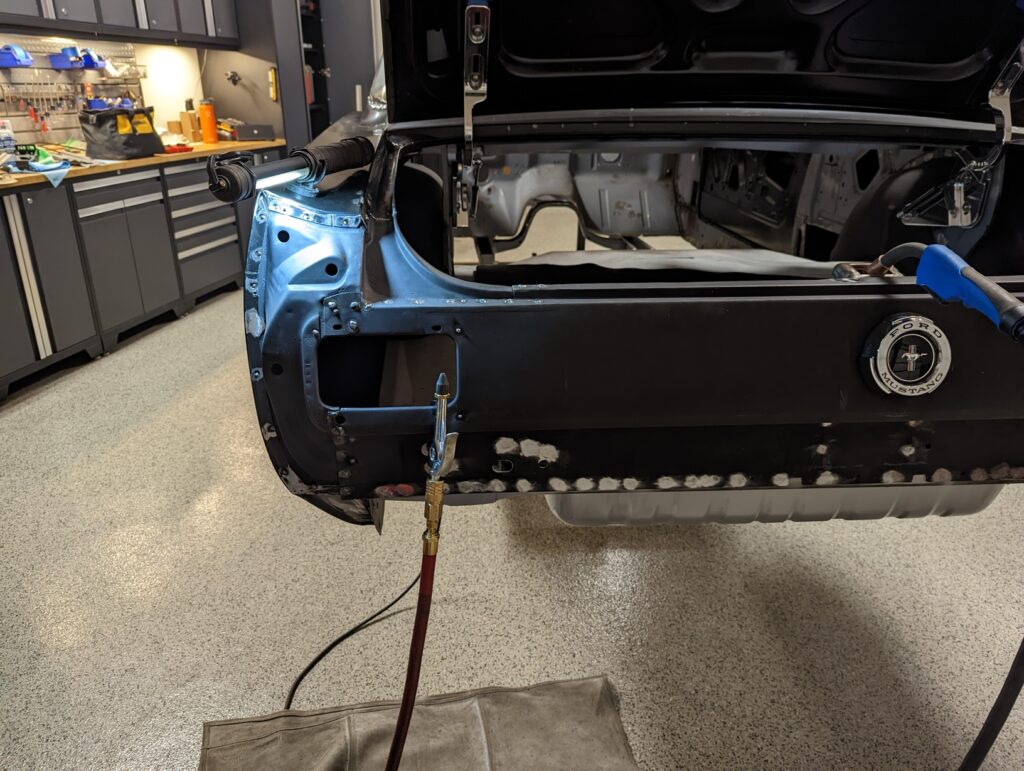 Took a similar pass at the quarter panel itself, scuffing, cleaning, and painting over any bare metal that wouldn’t serve as the exterior face around a plug weld.