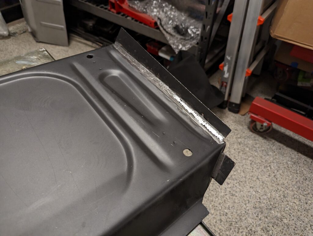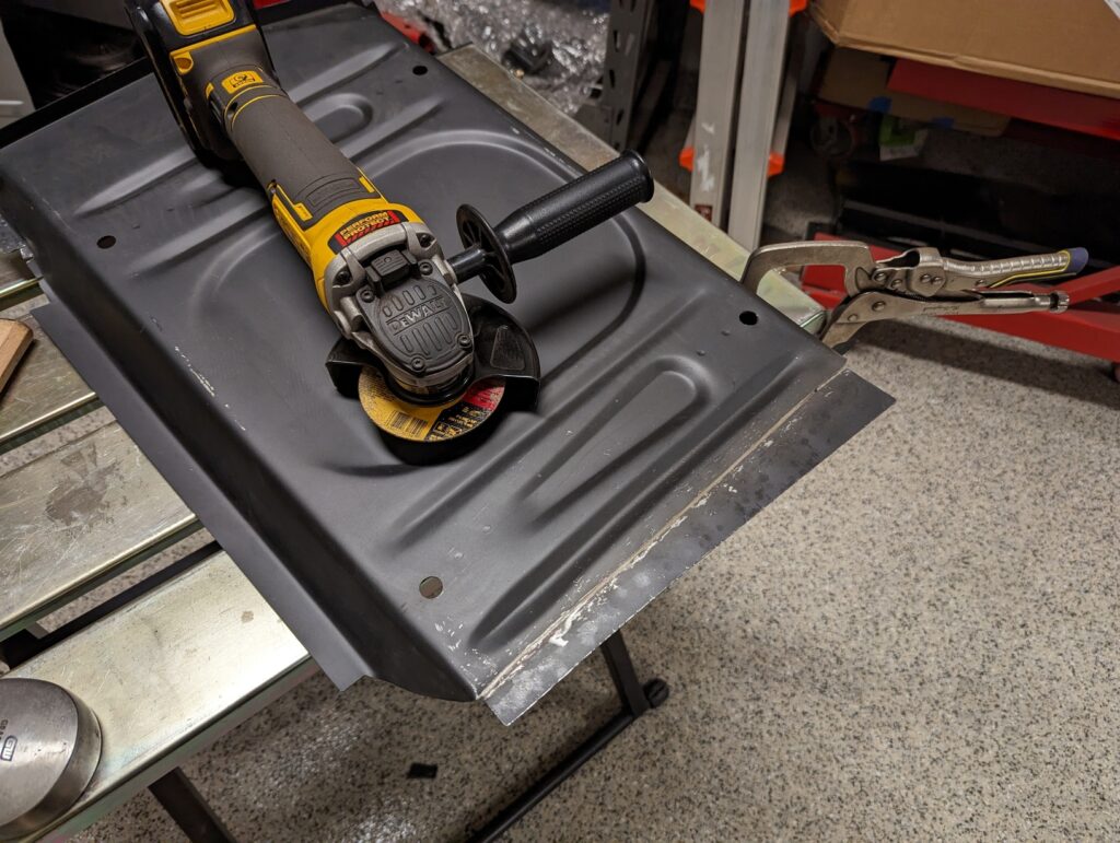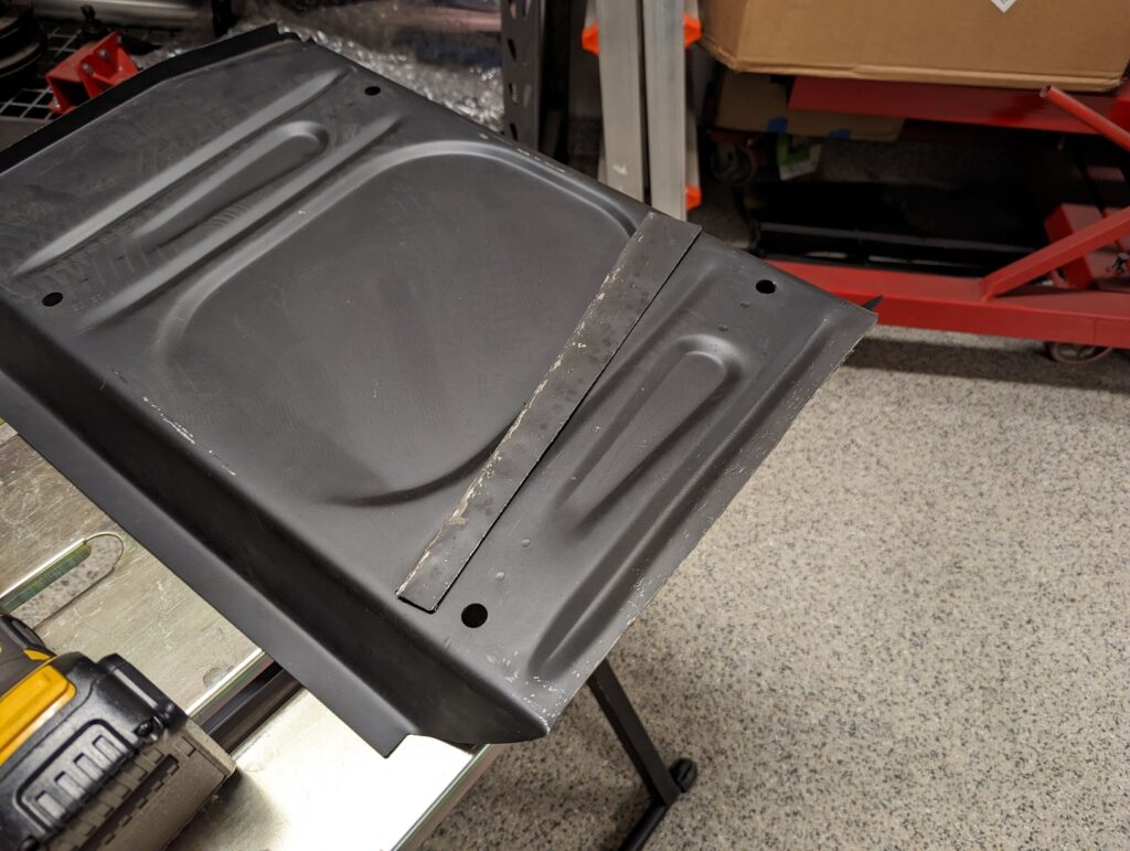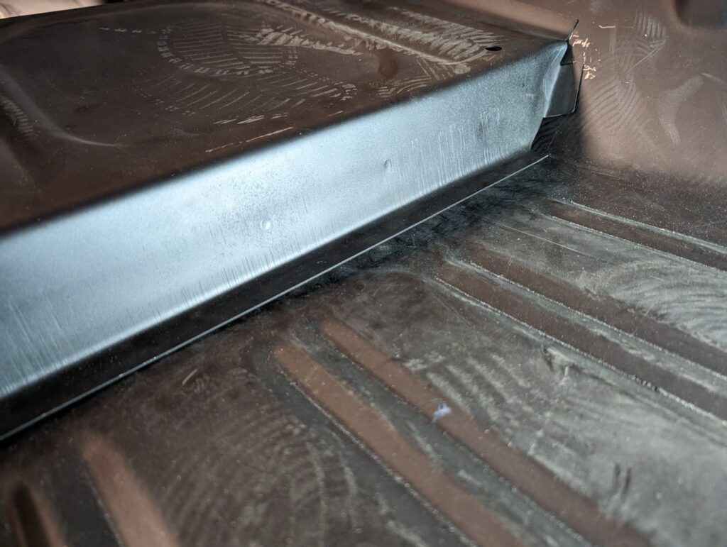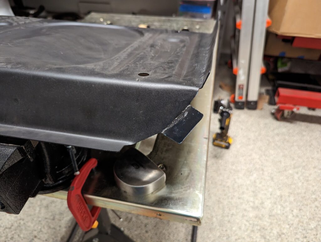 I determined that the seat riser wasn’t sitting down far enough because the flanges against the transmission tunnel were sticking out too far. In order to bring them in a bit I cut off both flanges and then re-welded them slightly inset from their original positions. Doing so gave me the clearance needed to close the gap between the bottom flange of the riser and the floor.