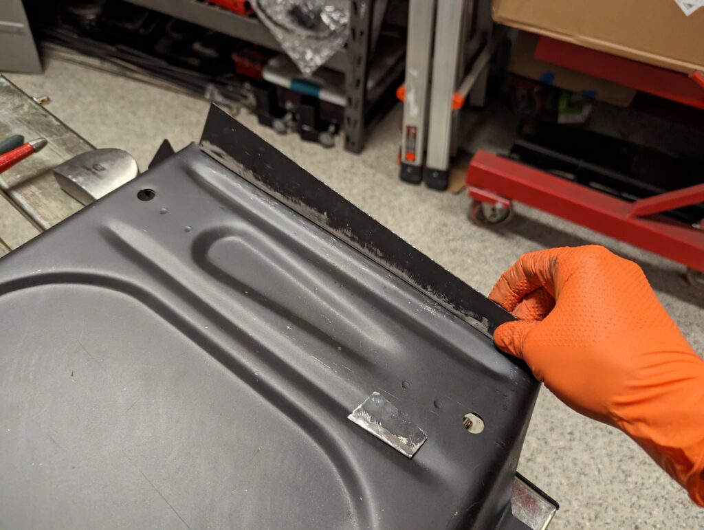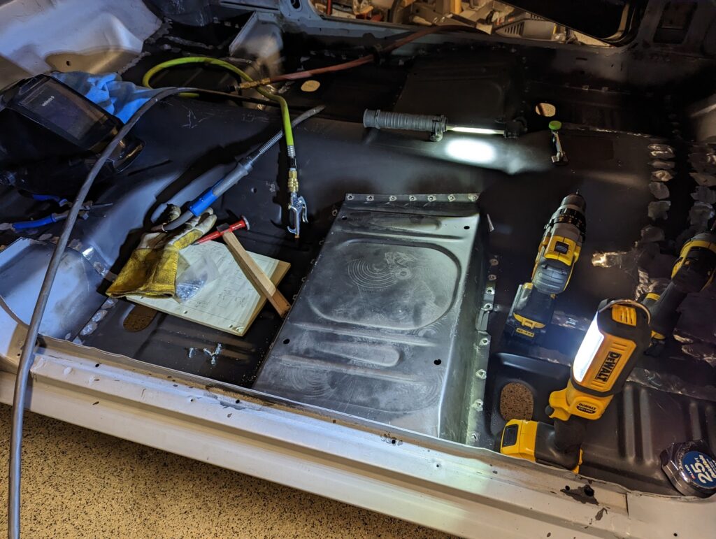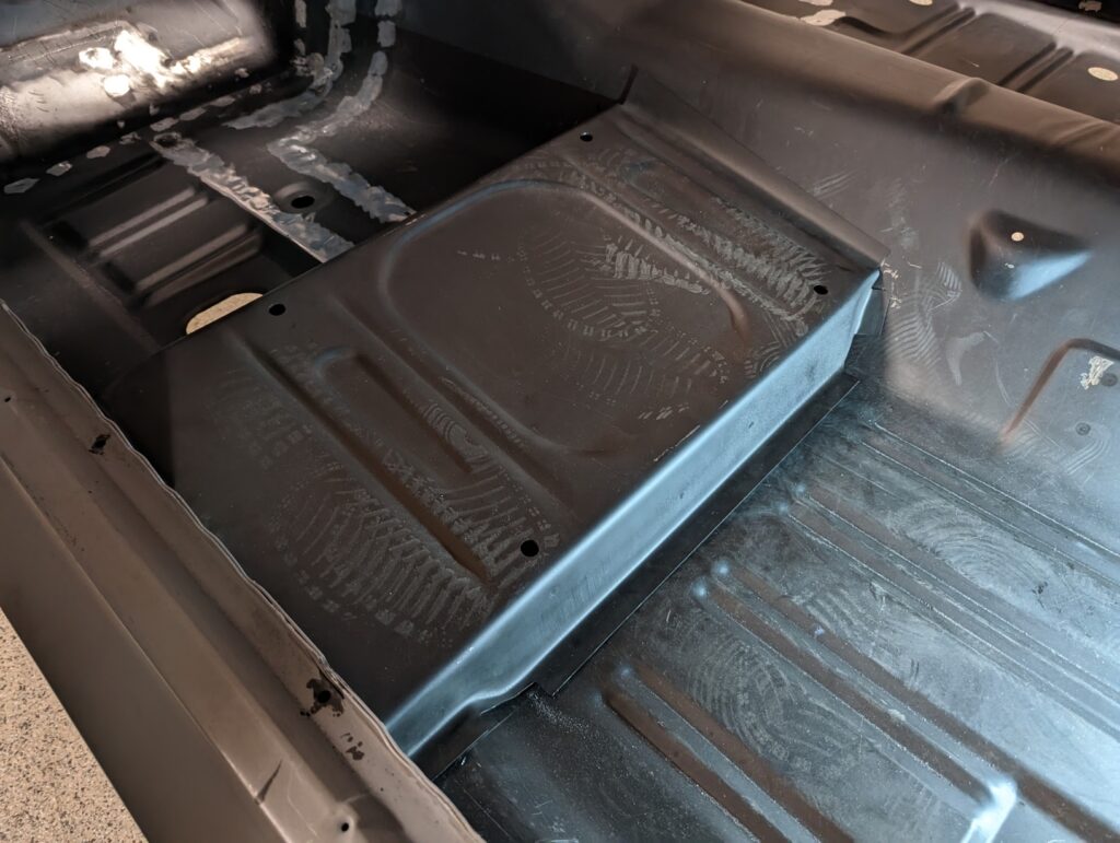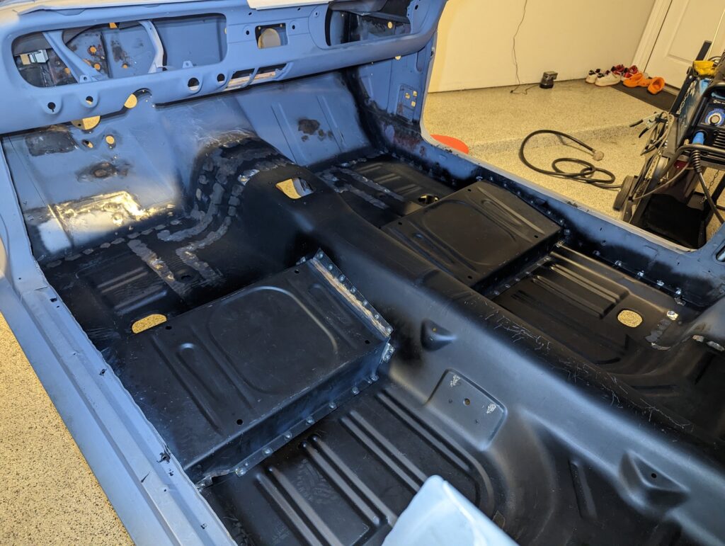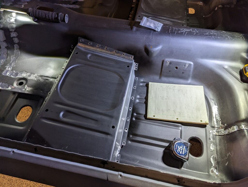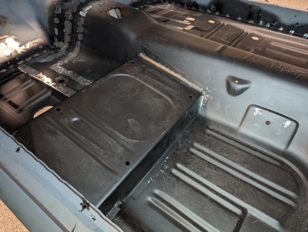 I determined that the seat riser wasn’t sitting down far enough because the flanges against the transmission tunnel were sticking out too far. In order to bring them in a bit I cut off both flanges and then re-welded them slightly inset from their original positions. Doing so gave me the clearance needed to close the gap between the bottom flange of the riser and the floor.