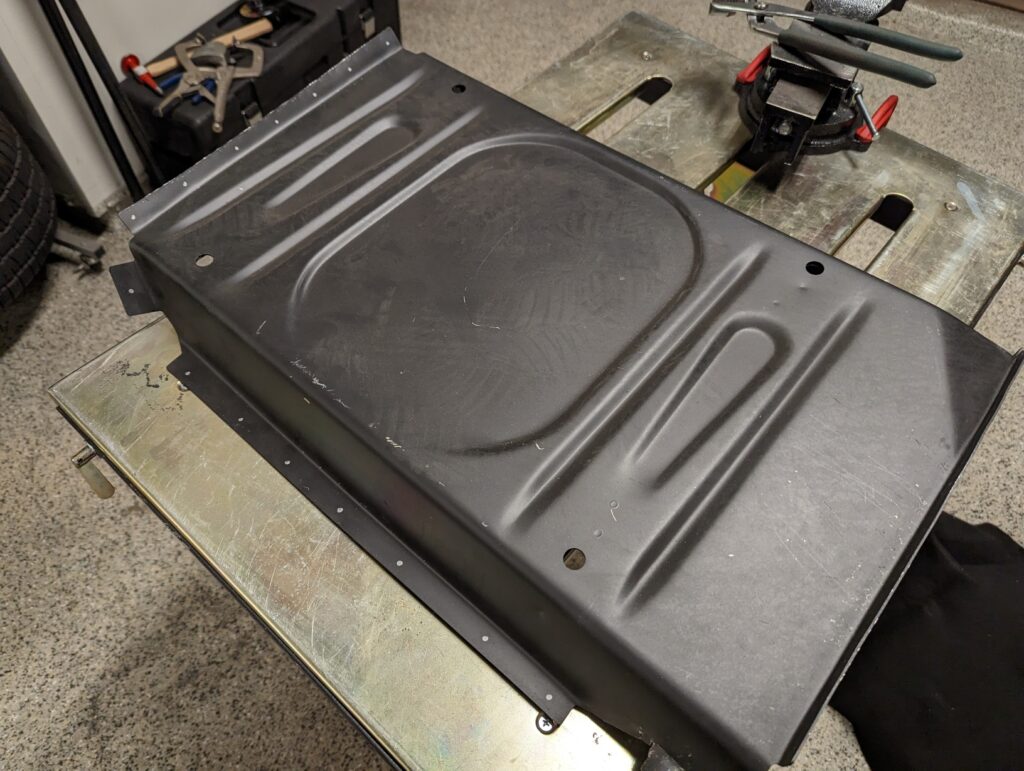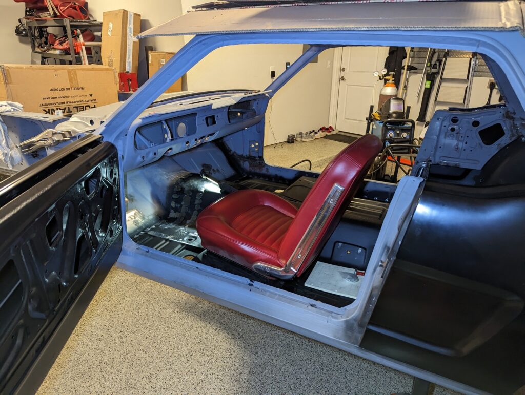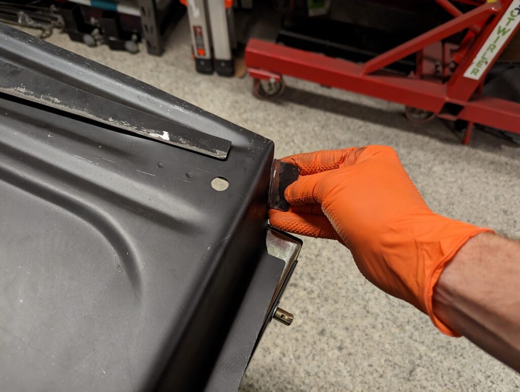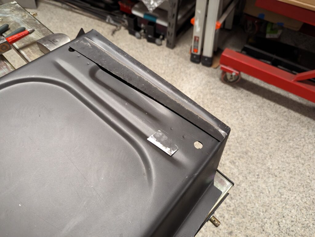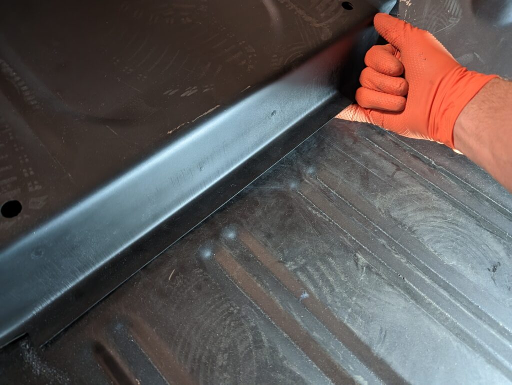 I determined that the seat riser wasn’t sitting down far enough because the flanges against the transmission tunnel were sticking out too far. In order to bring them in a bit I cut off both flanges and then re-welded them slightly inset from their original positions. Doing so gave me the clearance needed to close the gap between the bottom flange of the riser and the floor.