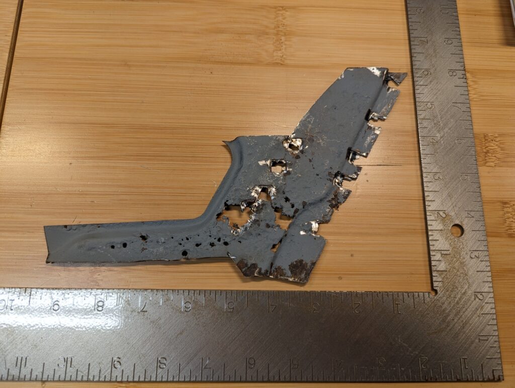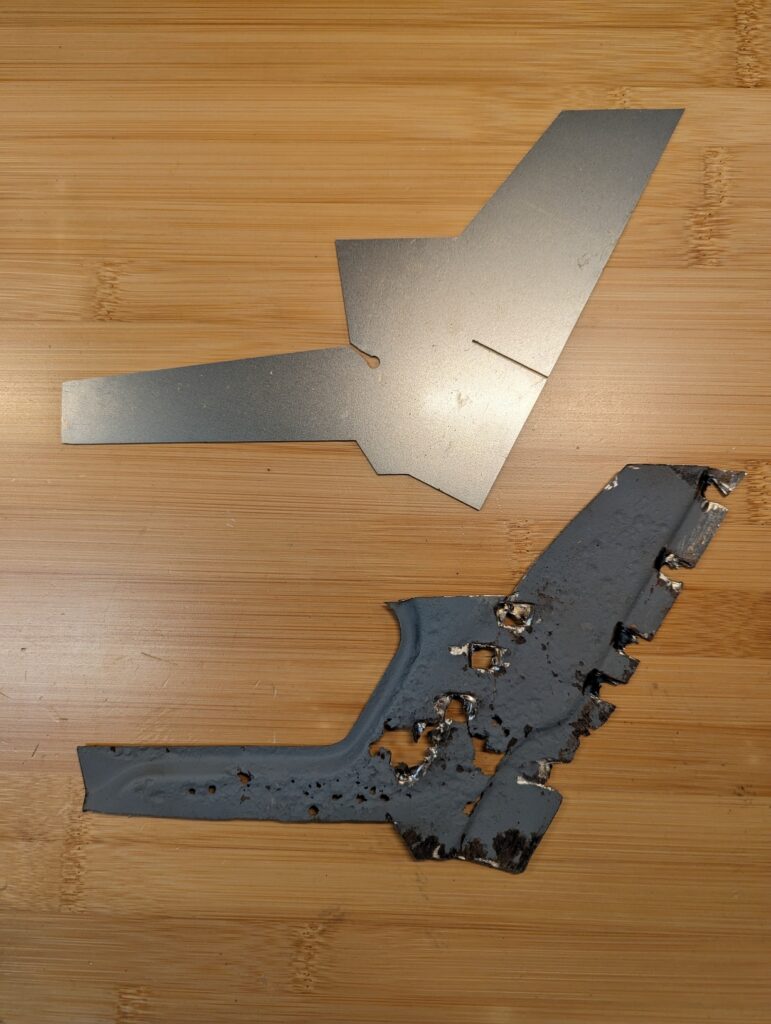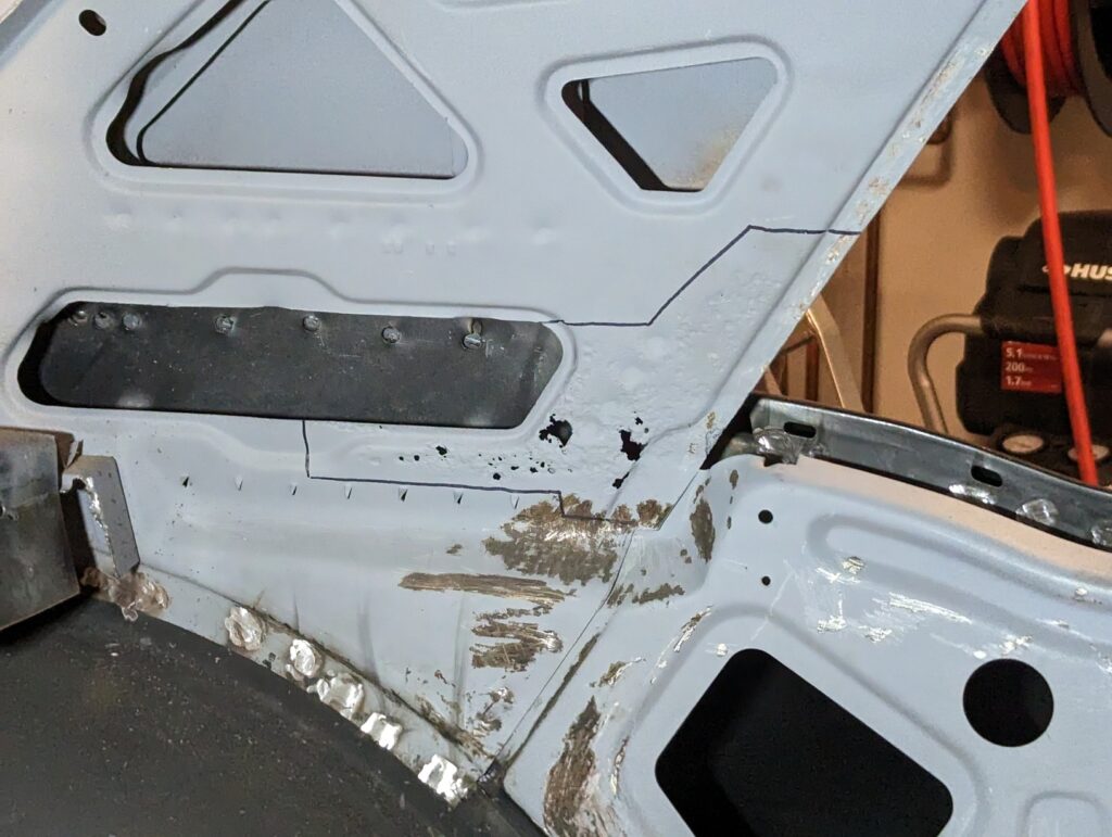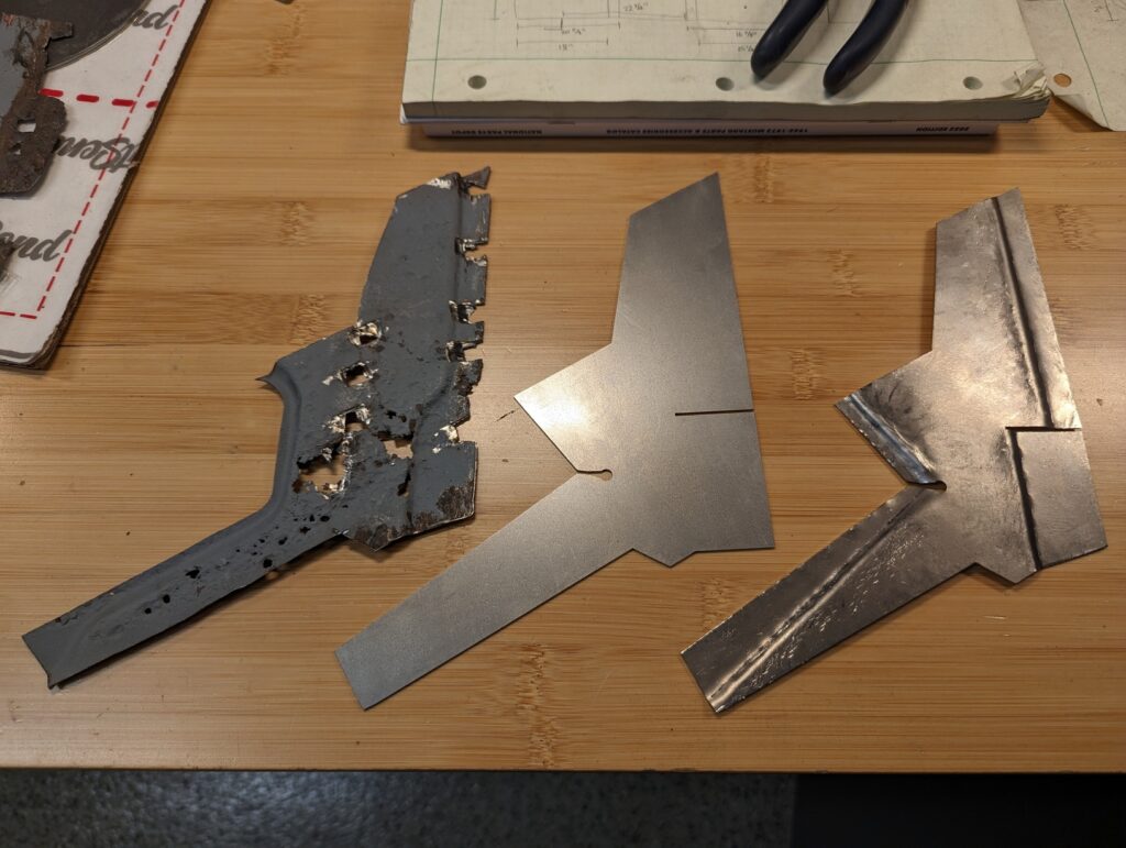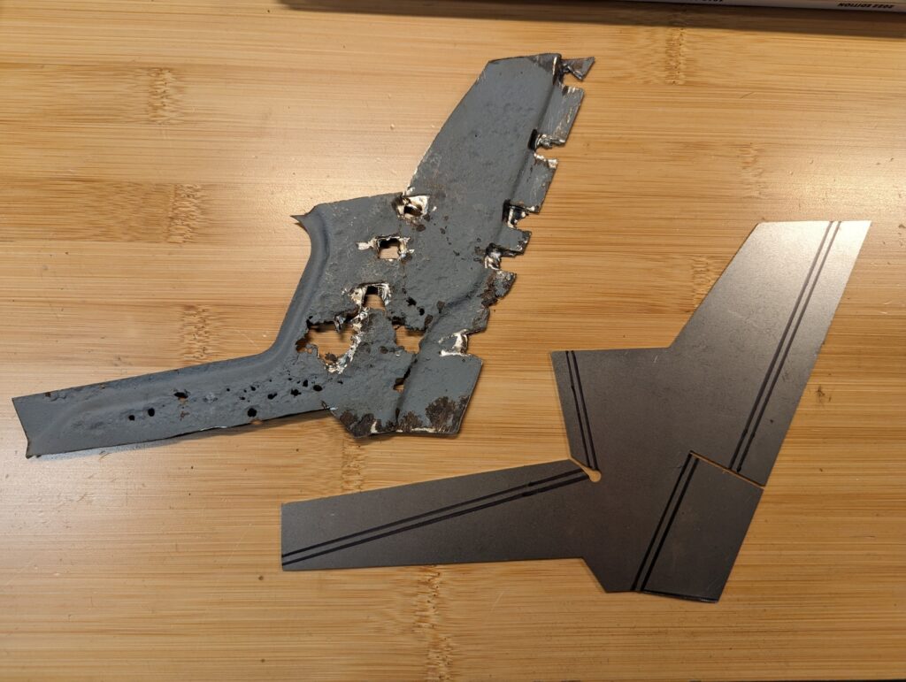 The majority of the car’s core structure was solid, unfortunately the primary exception was a section on the inside of the driver’s side C pillar. A highly awkward area that isn’t reproduced, I had no good options other than reproducing the part somehow. Due to the mildly complex curves on the flanges I knew I didn’t own the correct tools to fabricate a passable patch panel myself without creating many tiny pieces and welding them all together. Instead I decided to give the CAD-based laser cutting another go.