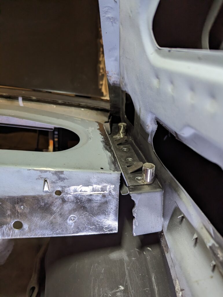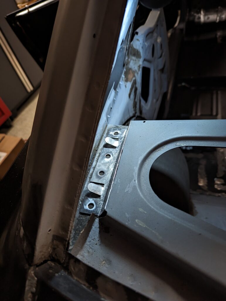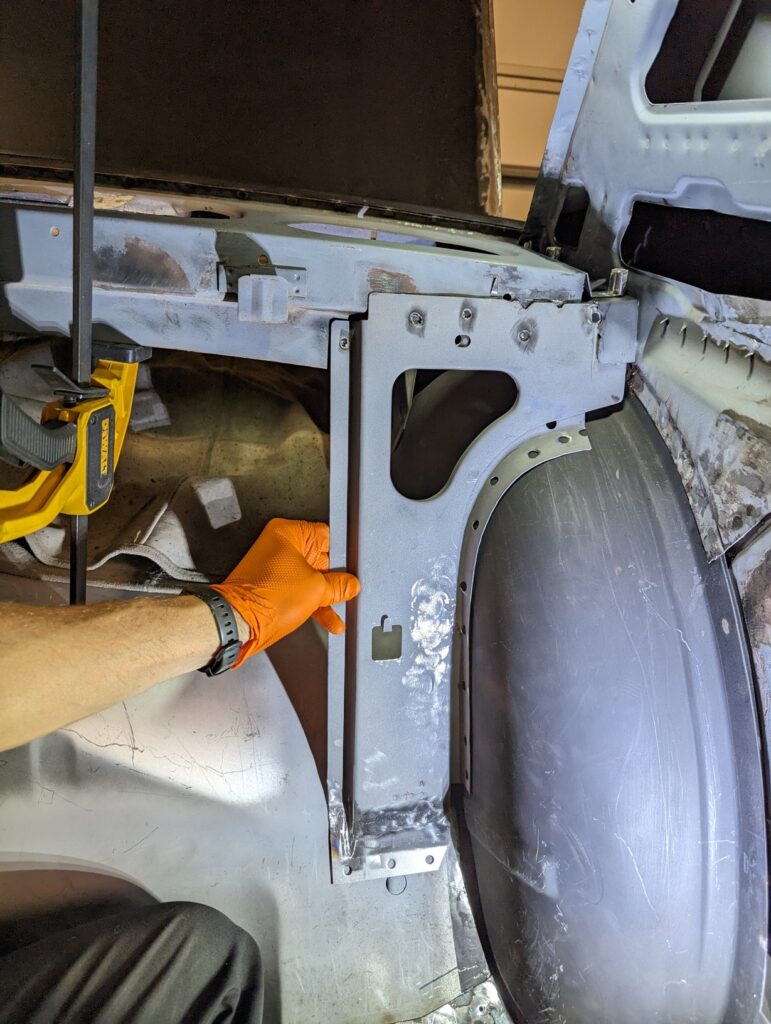 With magnets holding the patch in place I used an inverted clamp to set the height of the package shelf by using the rear seat support bracket as a reference, matching the spot weld holes to their original location on the package shelf.