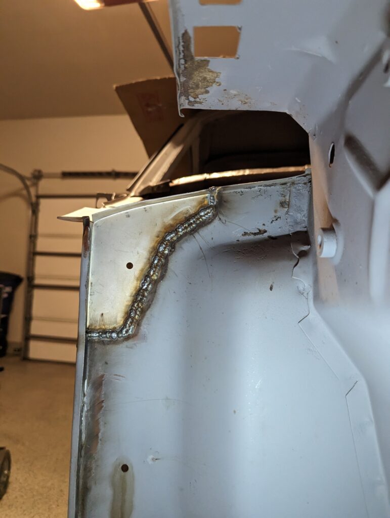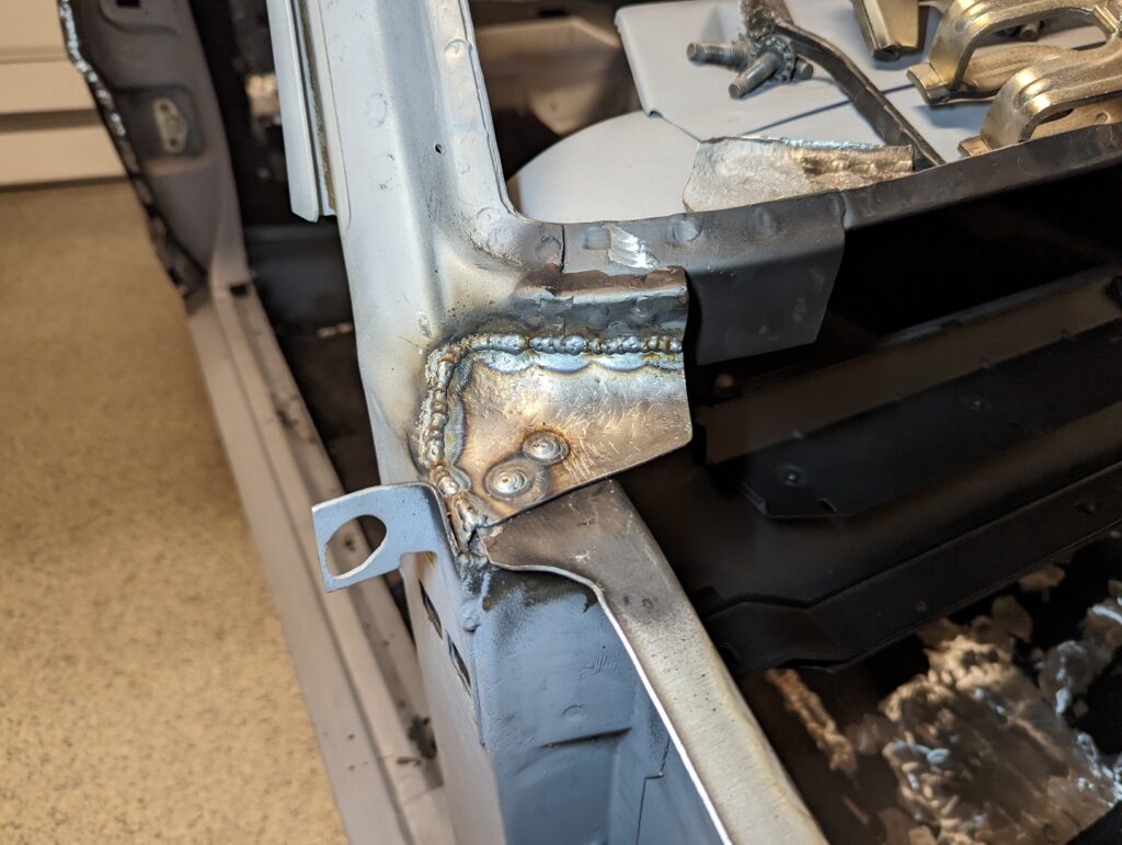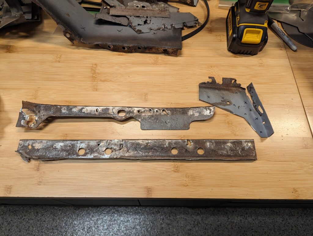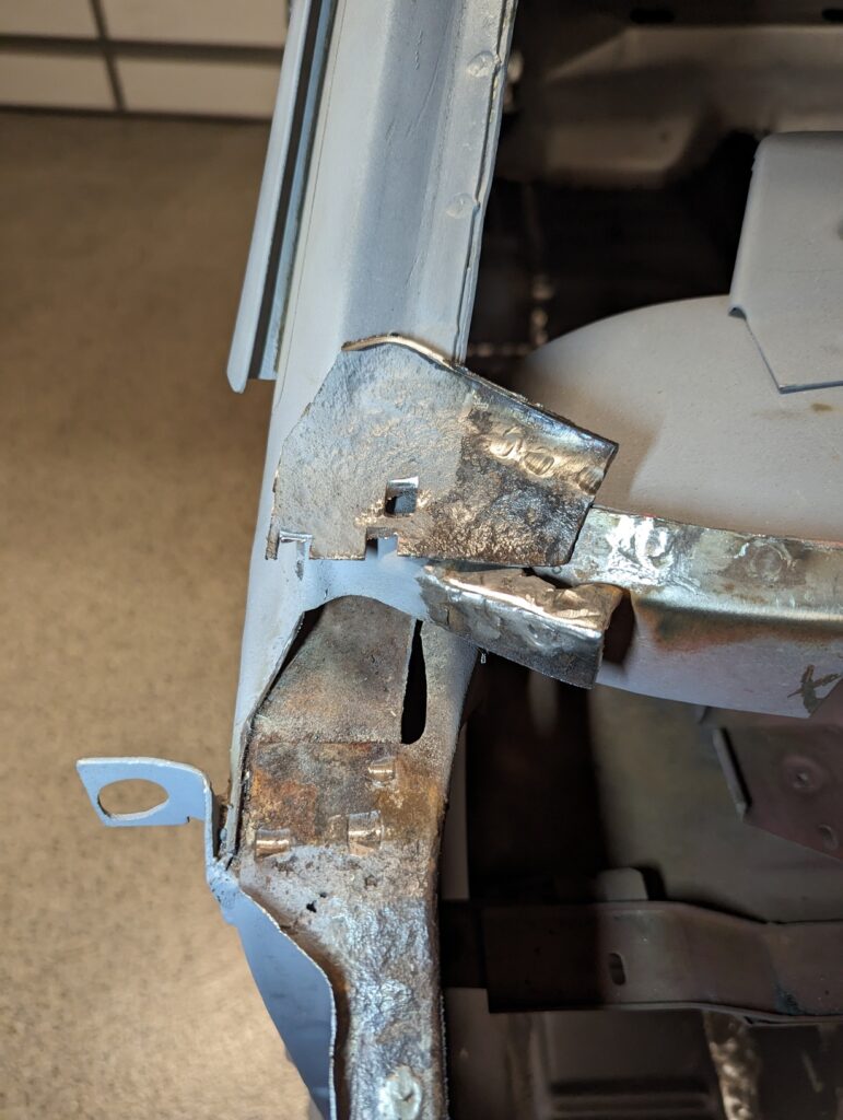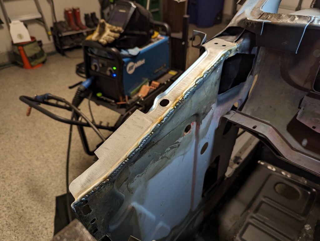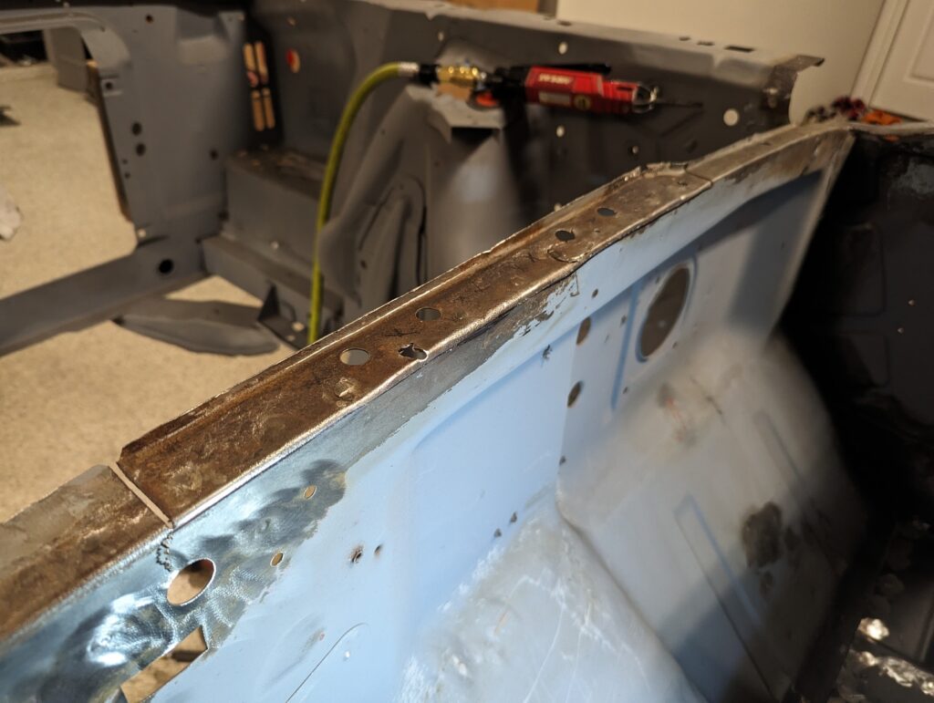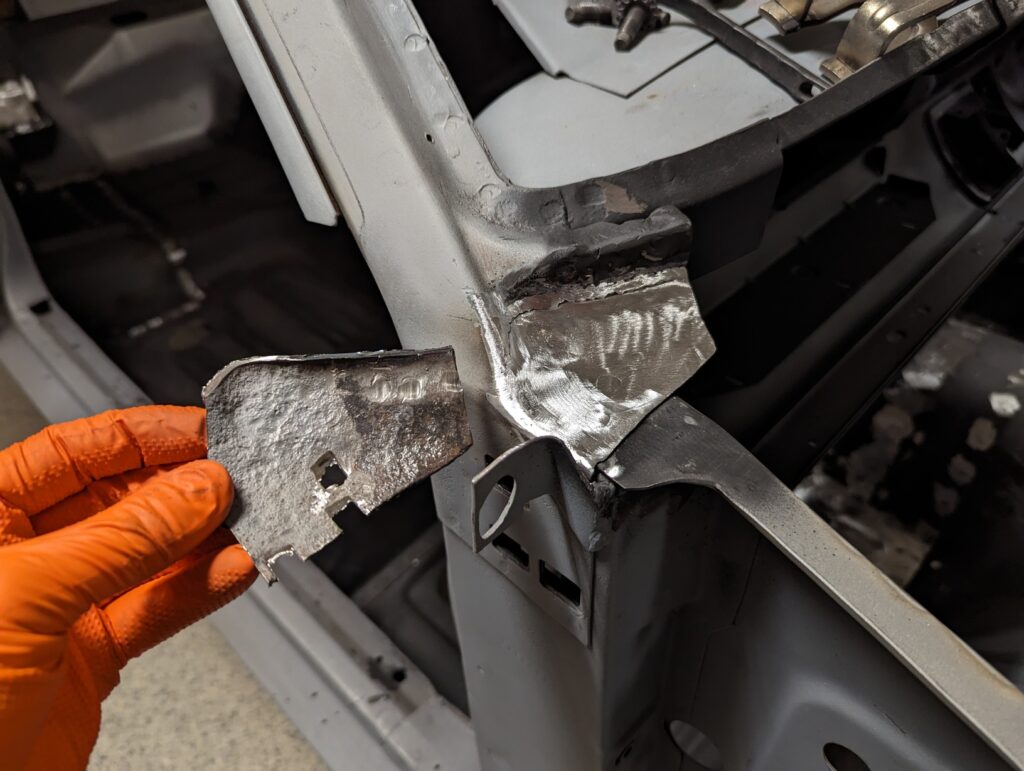 The passenger side went must as the driver’s side did, albeit slightly faster since I knew what I was getting myself into. I started with the top flange of the firewall where the export brace bolts to. There was a lot of pitting and some holes from where spot welds ripped out rather than separating cleanly so it was time for some fresh metal.