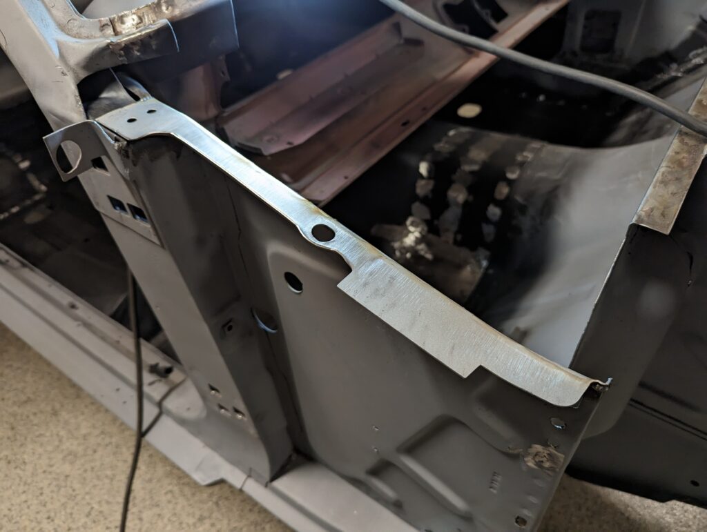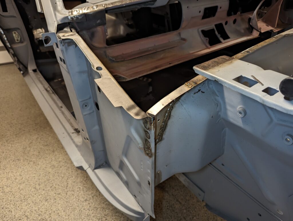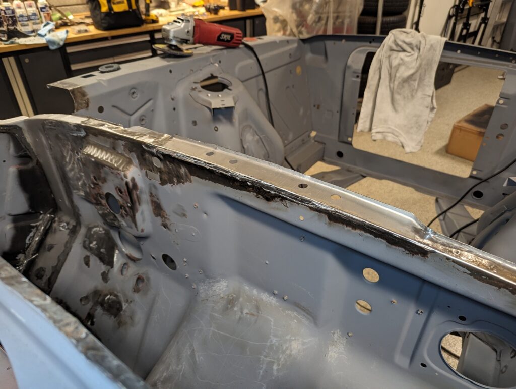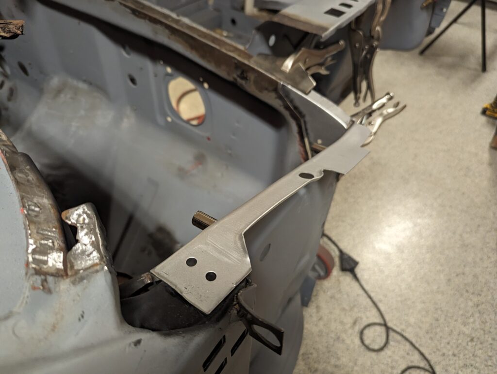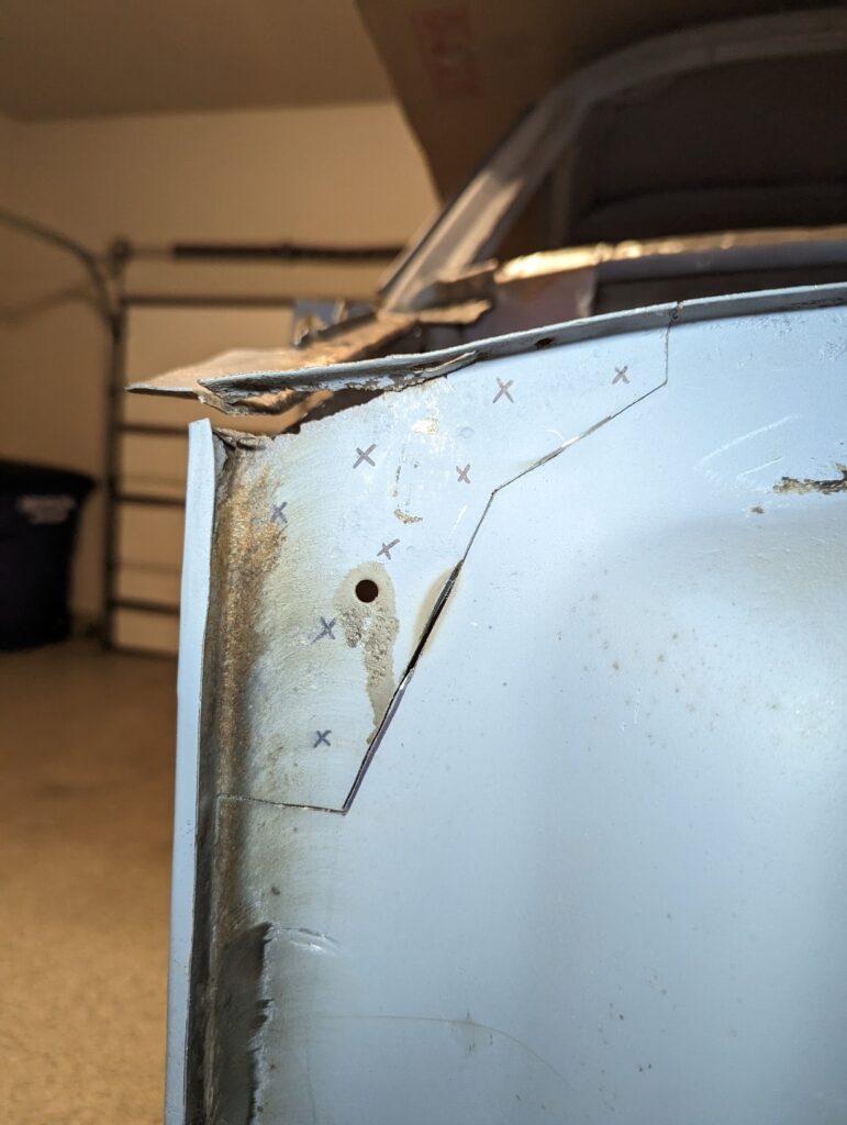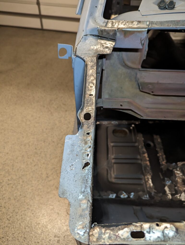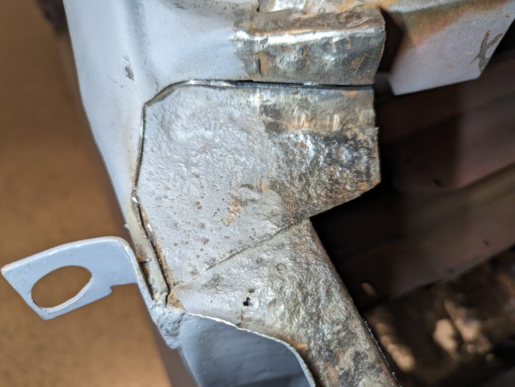 The passenger side went must as the driver’s side did, albeit slightly faster since I knew what I was getting myself into. I started with the top flange of the firewall where the export brace bolts to. There was a lot of pitting and some holes from where spot welds ripped out rather than separating cleanly so it was time for some fresh metal.