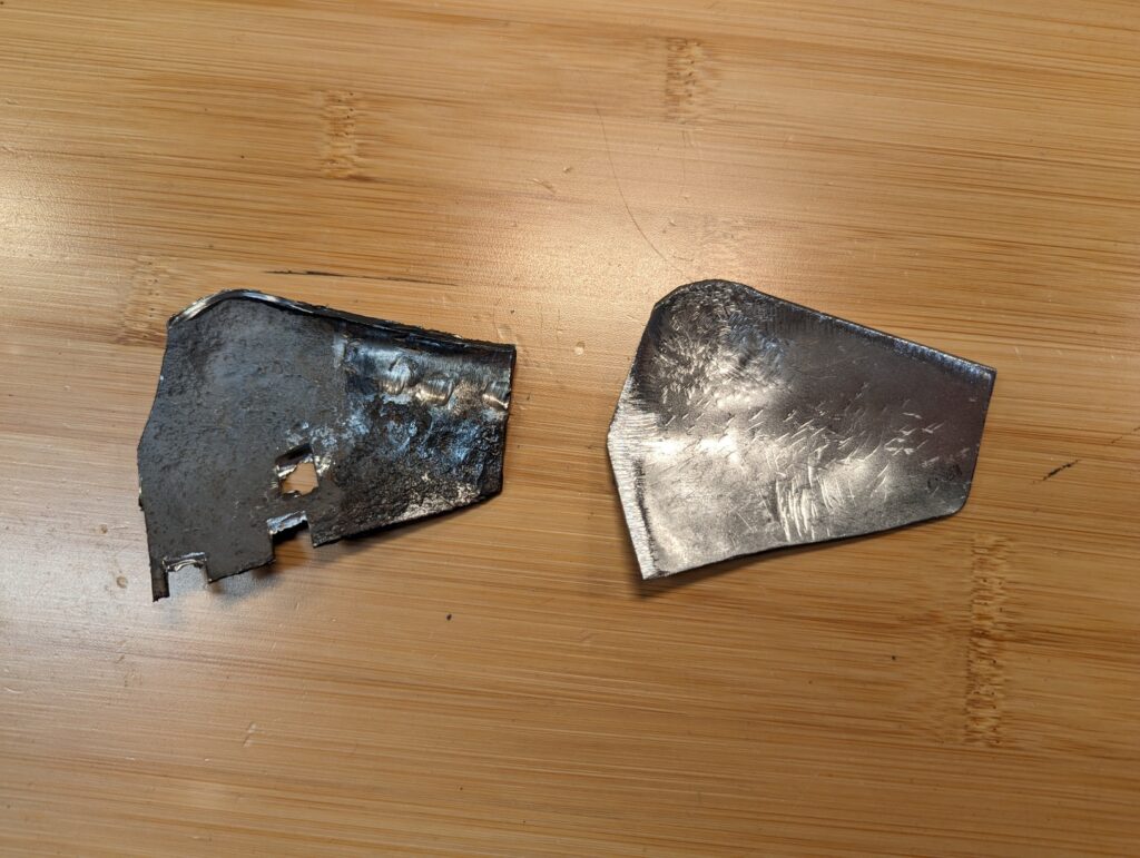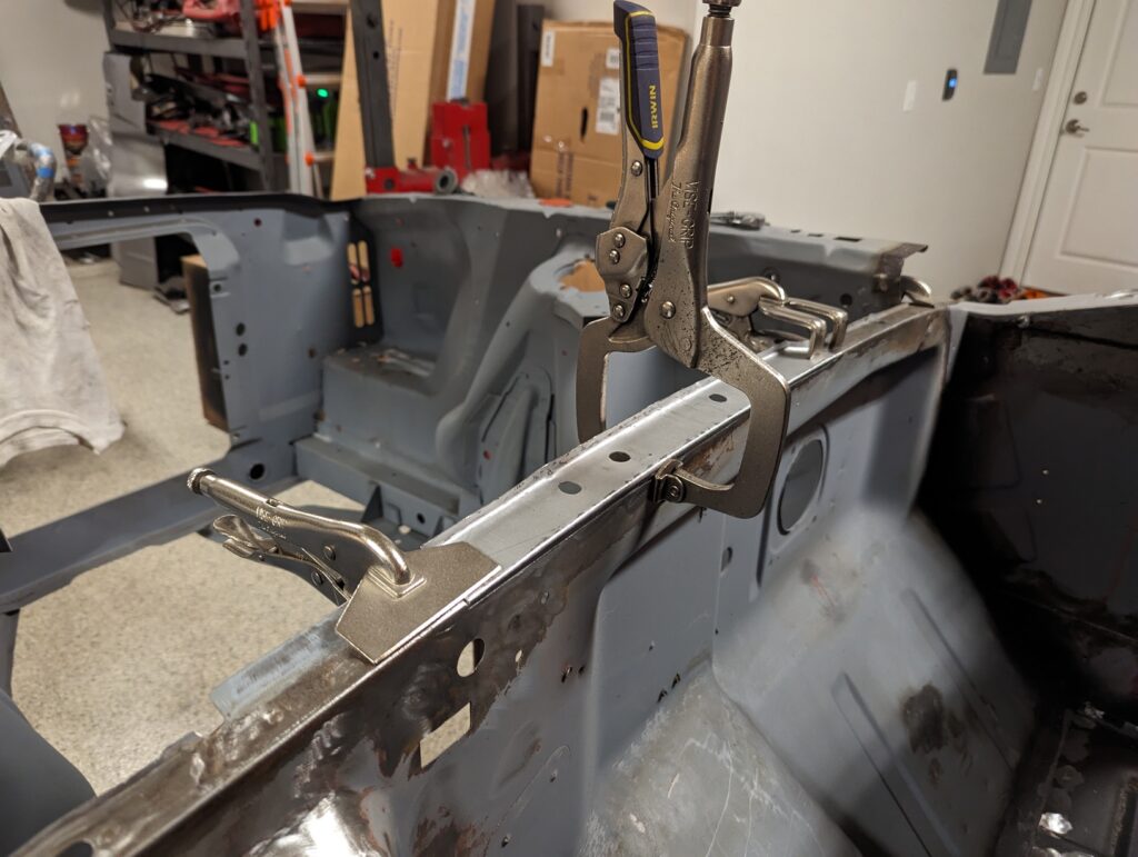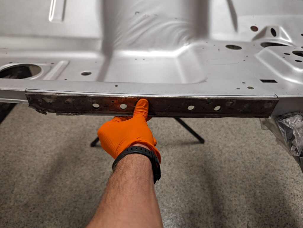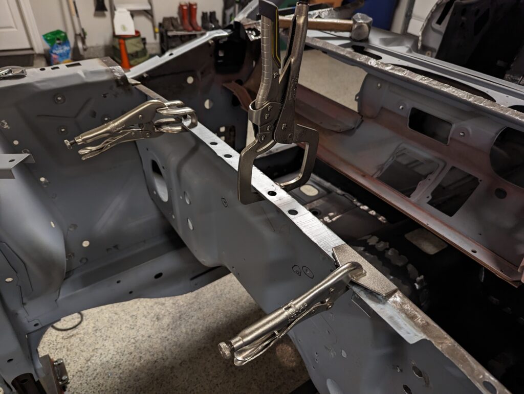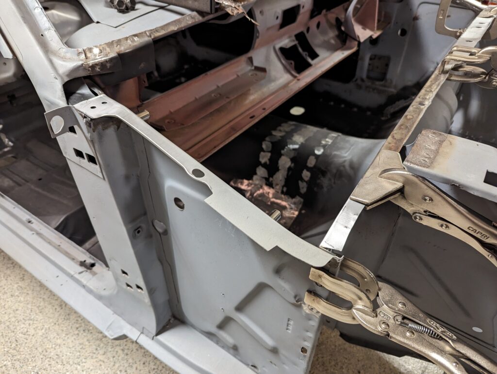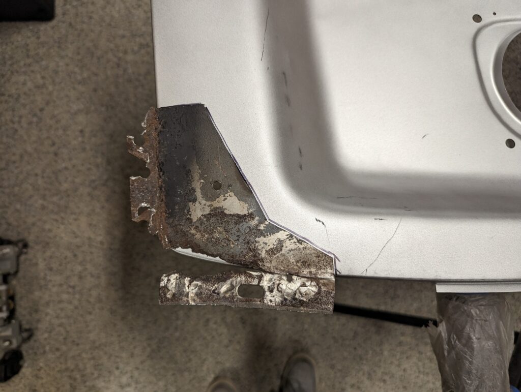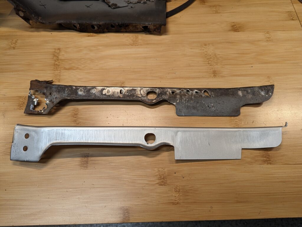 The passenger side went must as the driver’s side did, albeit slightly faster since I knew what I was getting myself into. I started with the top flange of the firewall where the export brace bolts to. There was a lot of pitting and some holes from where spot welds ripped out rather than separating cleanly so it was time for some fresh metal.