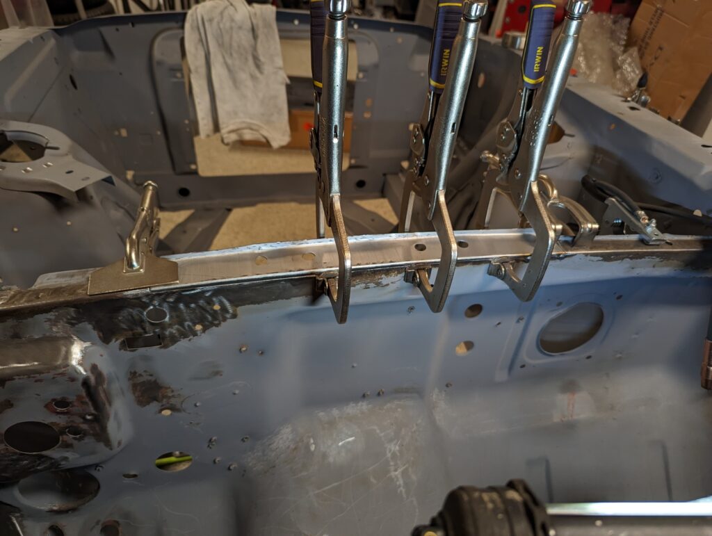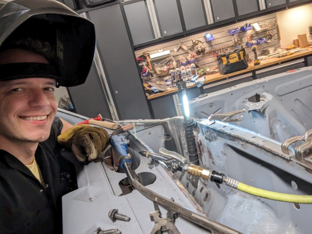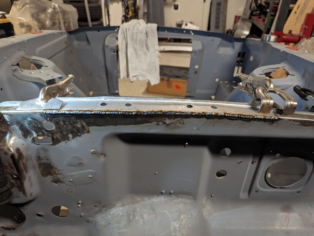 Sitting inside the car and leaning out over the dash through the windshield frame to weld the inside of the top firewall flange was a fun experience. Not something I ever thought I’d be doing during the first 15 years of driving the car.