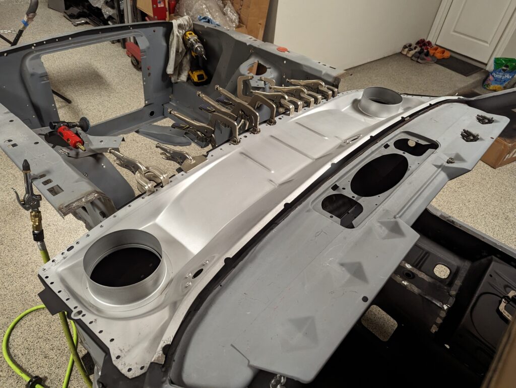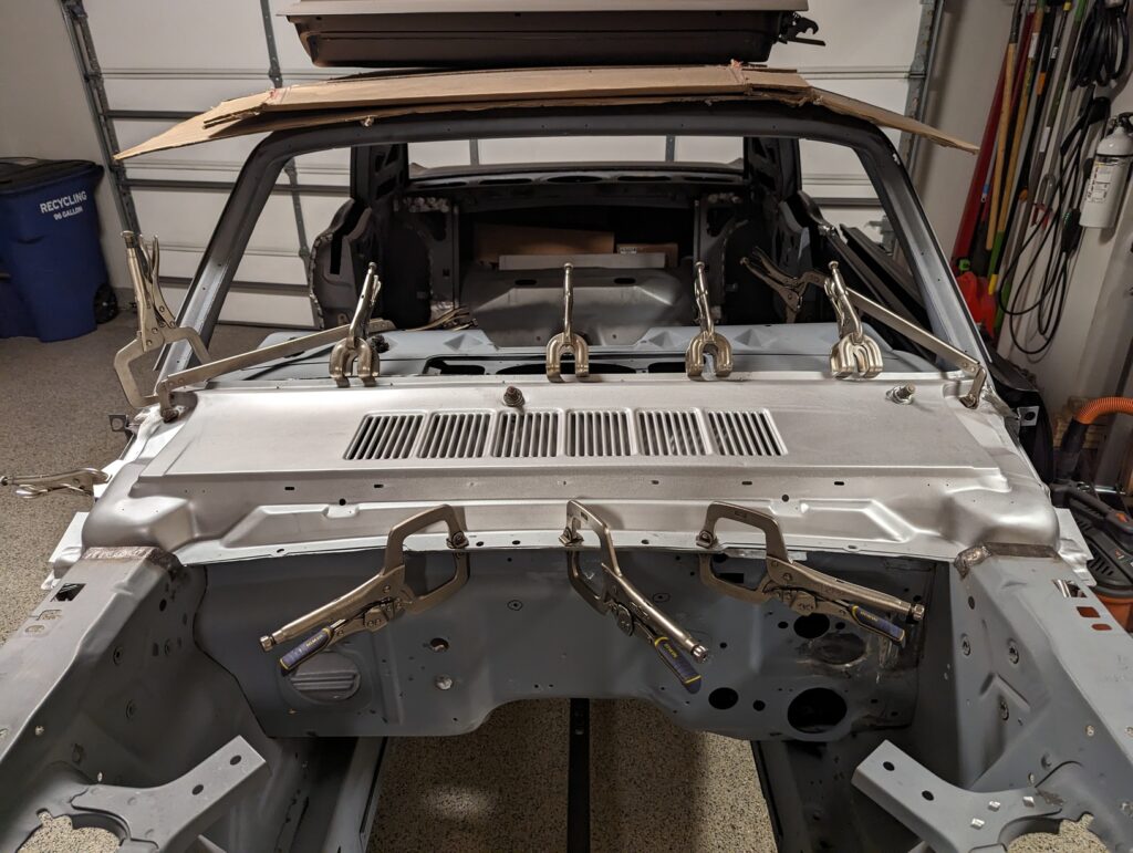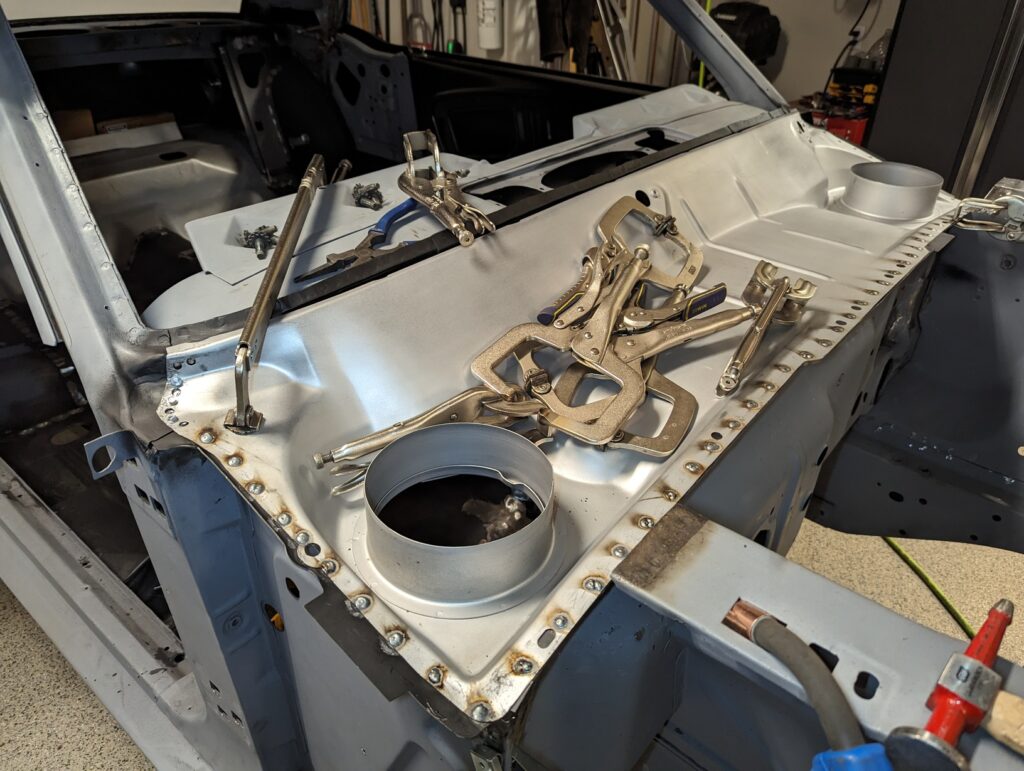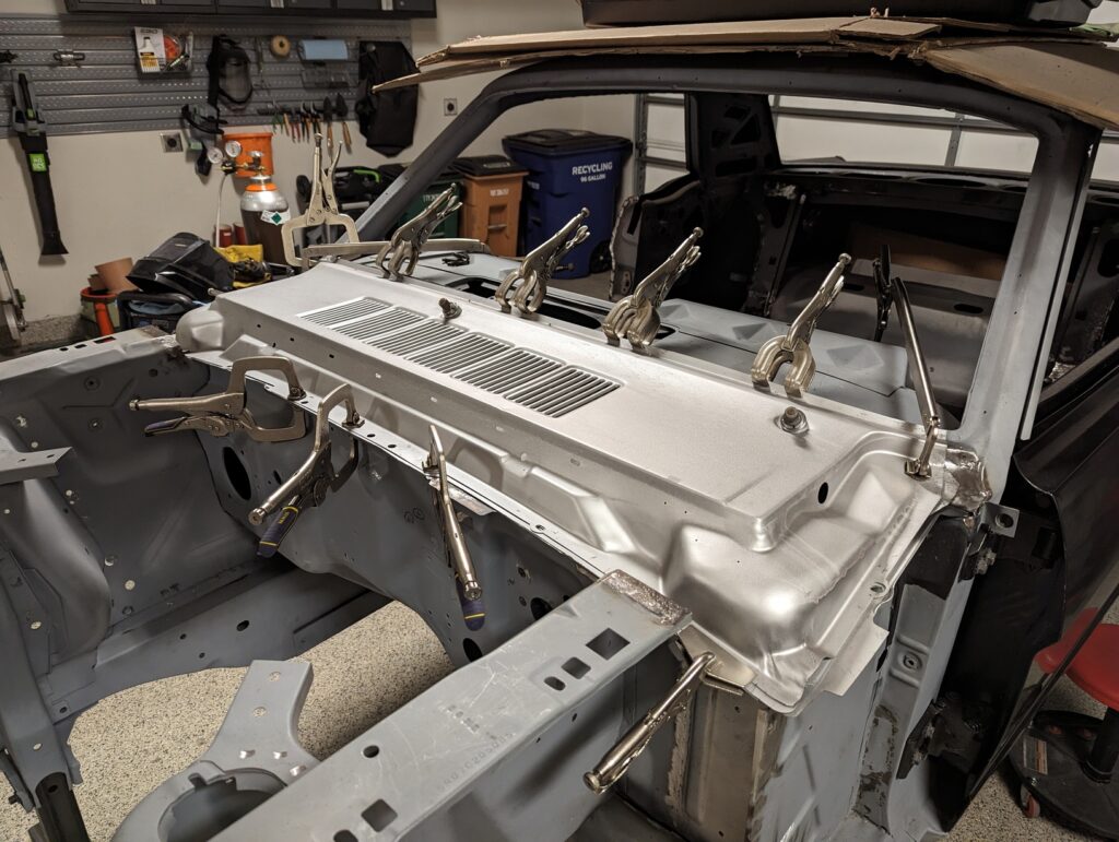 The base of the A pillars is where the reproduction cowl didn’t quite align perfectly, it took some creative clamping and extra sheet metal screws to pull everything flush for welding.