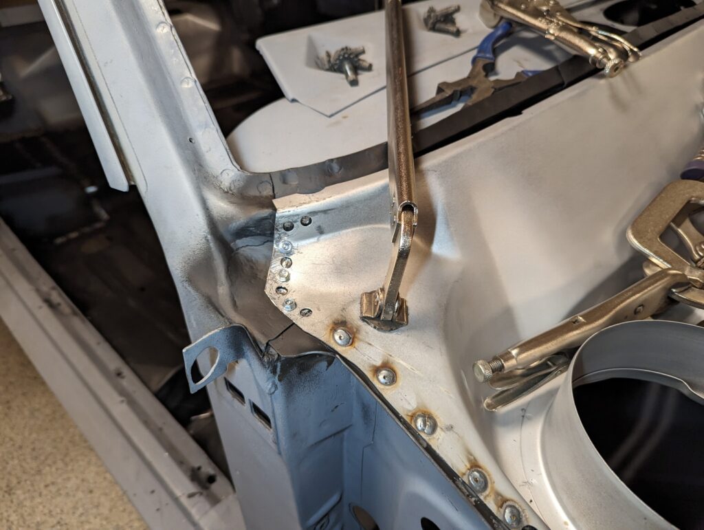 With the holes all drilled it was a matter of clamping, grinding away the paint on the mating surfaces of the spot welds, and welding them up.