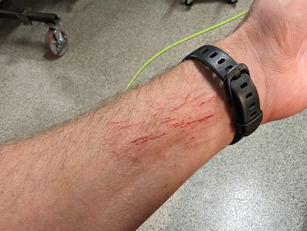 While cleaning up the originals I tried out a new wire brush drill attachment and apparently decided that the best idea was to hold the apron extension in my hand while using it. Probably not the best idea.