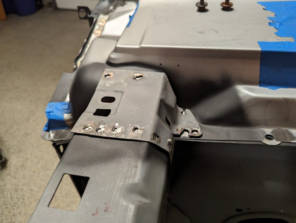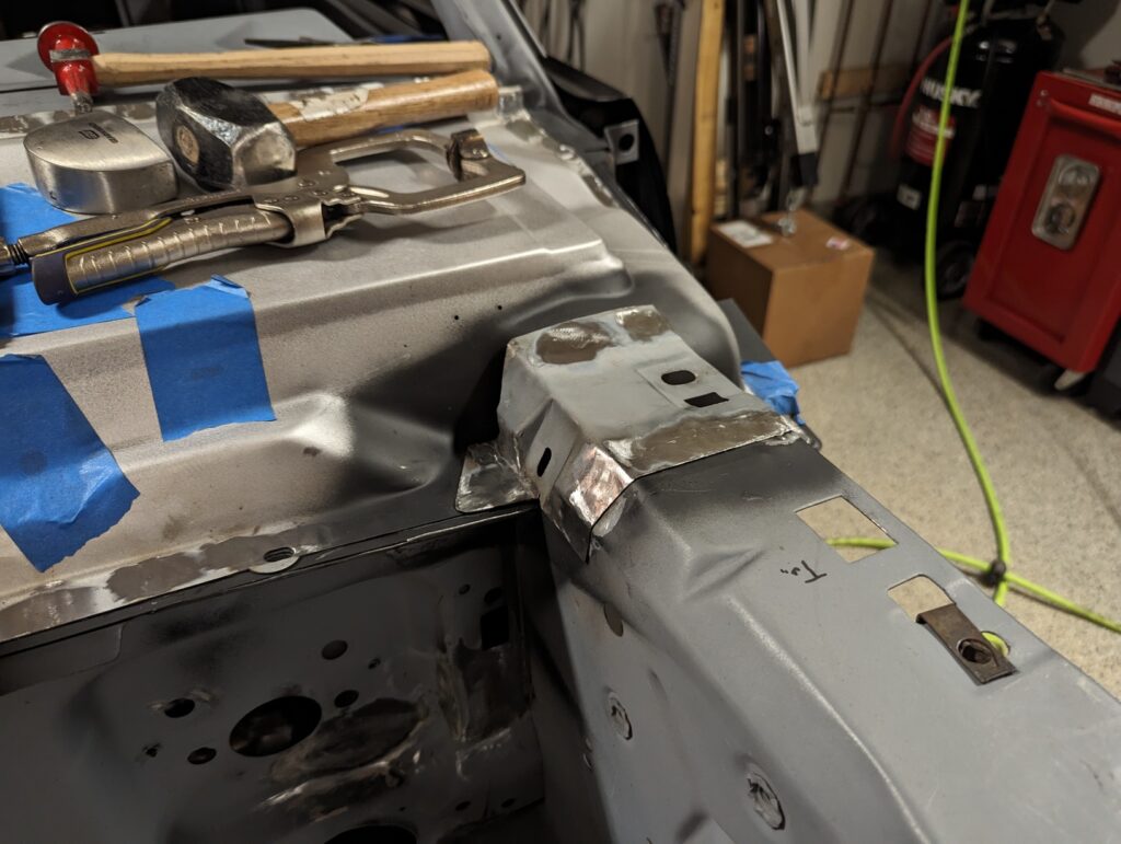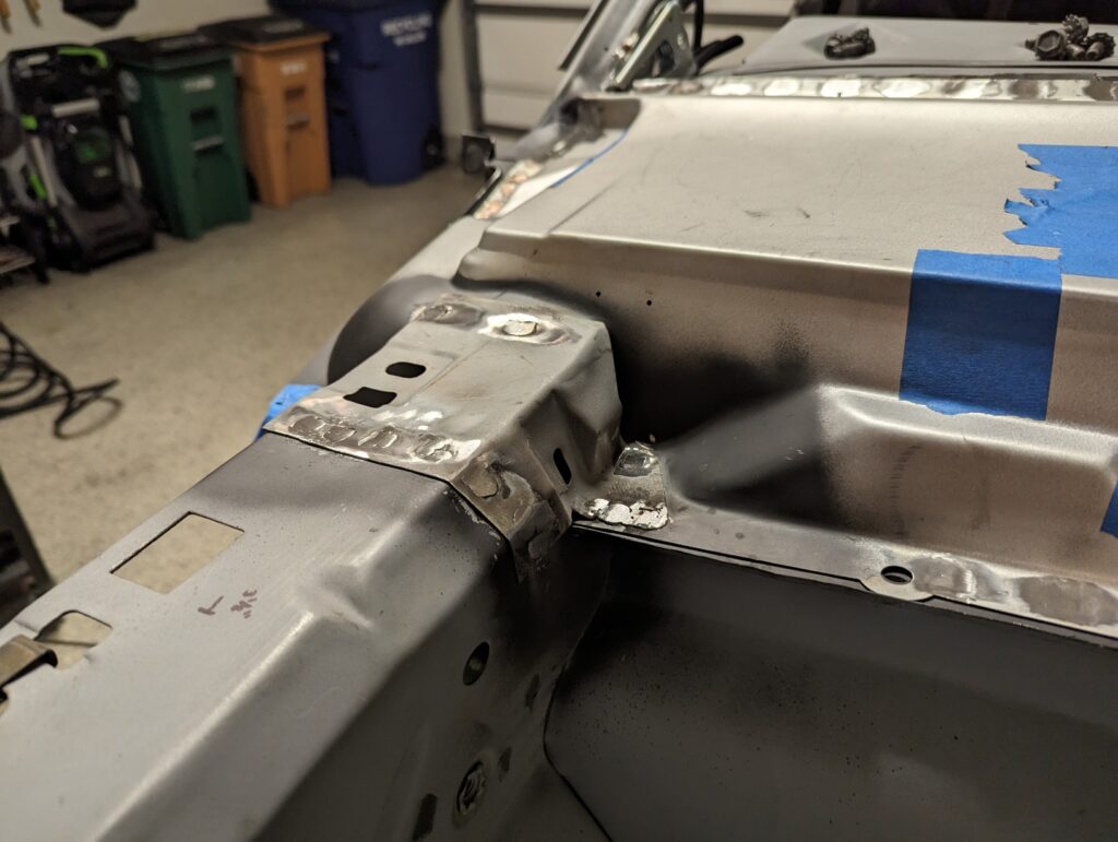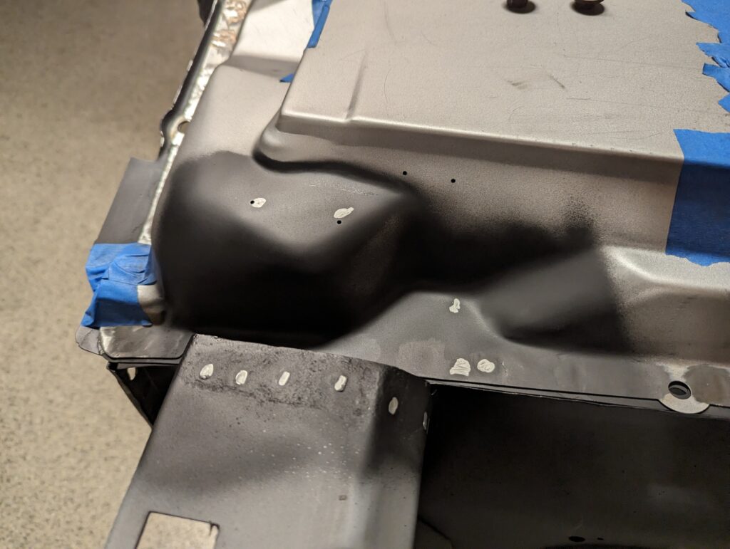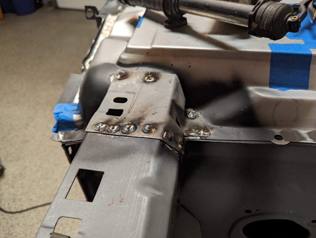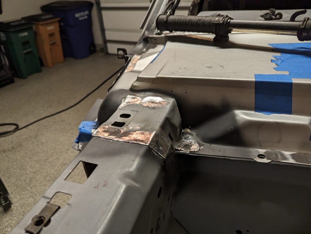 With the extensions cleaned up and the undersides coated in rust encapsulator the balance of the work was to mark out the appropriate locations for the spot weld, grind down to metal, weld up the spot welds, and grind everything smooth.